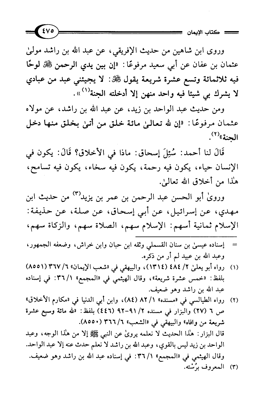 ومن حديث عبد الواحد بن زيد، عن عبد الله بن راشد، عن مولاه عثمان مرفوعًا: "إن لله تعالى مائة خلق من أتى بخلق منها دخل الجنة" (¬2).