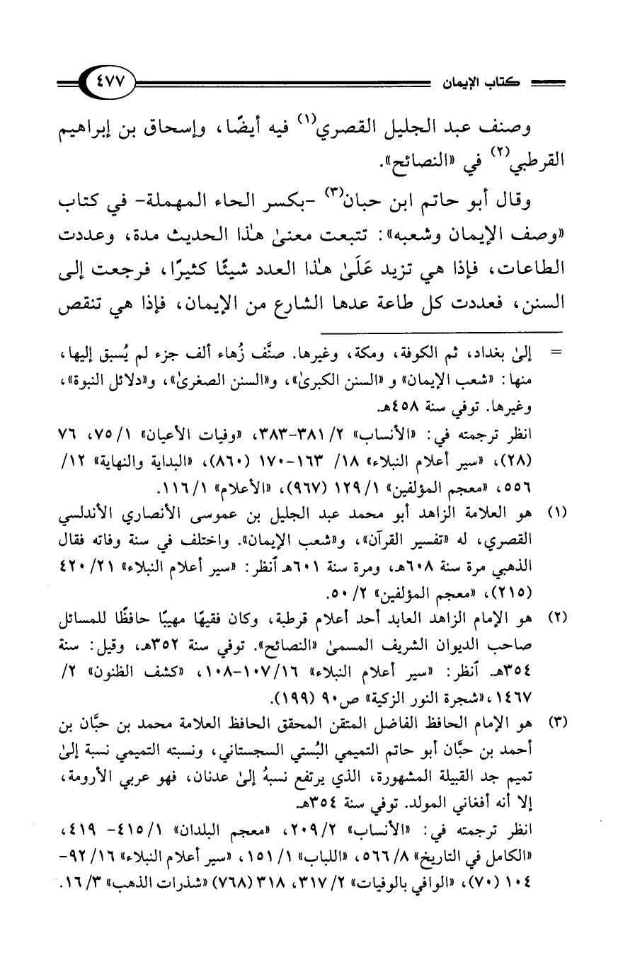 وقال أبو حاتم ابن حبان (¬3) -بكسر الحاء المهملة- في كتاب "وصف الإيمان وشعبه": تتبعت معنى هذا الحديث مدة، وعددت الطاعات، فإذا هي تزيد عَلَى هذا العدد شيئًا كثيرًا، فرجعت إلى السنن، فعددت كل طاعة عدها الشارع من الإيمان، فإذا هي تنقص