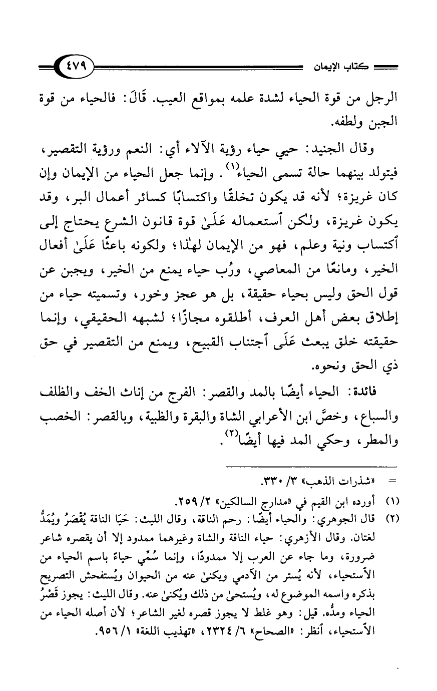 وقال الجنيد: حيي حياء رؤية الآلاء أي: النعم ورؤية التقصير، فيتولد بينهما حالة تسمى الحياء (¬1). وإنما جعل الحياء من الإيمان وإن كان غريزة؛ لأنه قد يكون تخلقًا واكتسابًا كسائر أعمال البر، وقد يكون غريزة، ولكن استعماله على قوة قانون الشرع يحتاج إلى اكتساب ونية وعلم، فهو من الإيمان لهذا؛ ولكونه باعثًا عَلَى أفعال الخير، ومانعًا من المعاصي، ورب حياء يمنع من الخير، ويجبن عن قول الحق وليس بحياء حقيقة، بل هو عجز وخور، وتسميته حياء من إطلاق بعض أهل العرف، أطلقوه مجازًا؛ لشبهه الحقيقي، وإنما حقيقته خلق يبعث عَلَى اجتناب القبيح، ويمنع من التقصير في حق ذي الحق ونحوه.