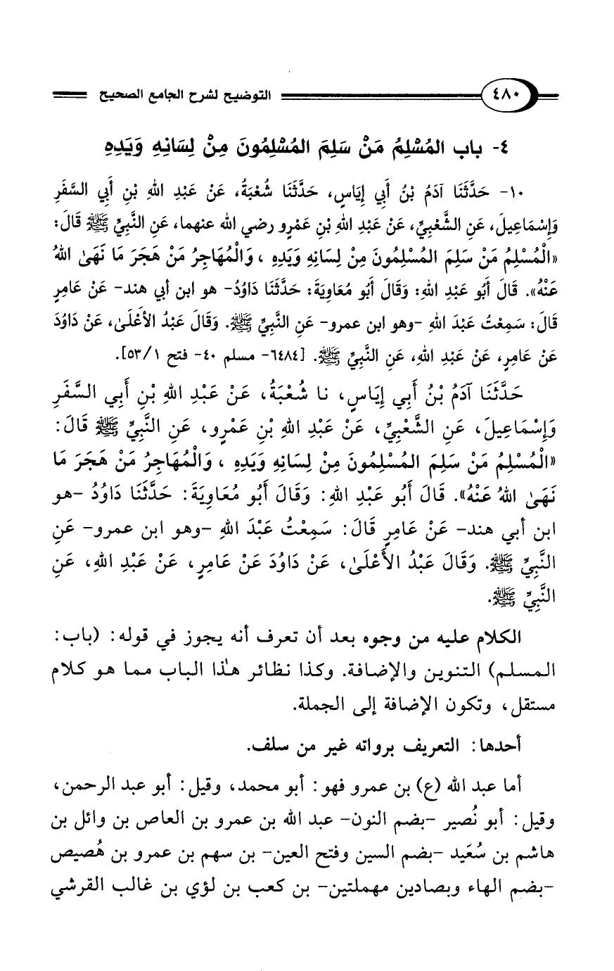 10 - حَدَّثَنَا آدَمُ بْنُ أَبِى إِيَاسٍ، حَدَّثَنَا شُعْبَةُ، عَنْ عَبْدِ اللهِ بْنِ أَبِى السَّفَرِ وَإِسْمَاعِيلَ، عَنِ الشَّعْبِىِّ، عَنْ عَبْدِ اللهِ بْنِ عَمْرٍو - رضى الله عنهما -، عَنِ النَّبِىِّ - صلى الله عليه وسلم - قَالَ: "الْمُسْلِمُ مَنْ سَلِمَ الْمُسْلِمُونَ مِنْ لِسَانِهِ وَيَدِهِ، وَالْمُهَاجِرُ مَنْ هَجَرَ مَا نَهَى اللهُ عَنْهُ". قَالَ أَبُو عَبْدِ اللهِ: وَقَالَ أَبُو مُعَاوِيَةَ: حَدَّثَنَا دَاوُدُ -هو ابن أبي هند- عَنْ عَامِرٍ قَالَ: سَمِعْتُ عَبْدَ اللهِ -وهو ابن عمرو- عَنِ النَّبِىِّ - صلى الله عليه وسلم -. وَقَالَ عَبْدُ الأَعْلَى، عَنْ دَاوُدَ عَنْ عَامِرٍ، عَنْ عَبْدِ اللهِ، عَنِ النَّبِىِّ - صلى الله عليه وسلم -. [6484 - مسلم 40 - فتح 1/ 53].