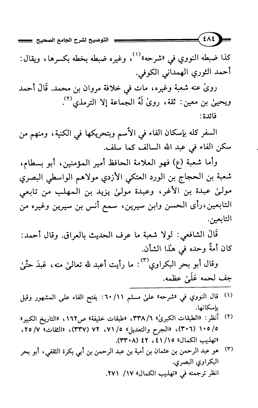 وأما شعبة (ع) فهو العلامة الحافظ أمير المؤمنين، أبو بسطام، شعبة بن الحجاج بن الورد العتكي الأزدي مولاهم الواسطي البصري مولى عبدة بن الأغر، وعبدة مولى يزيد بن المهلب من تابعي التابعين، رأى الحسن وابن سيرين، سمع أنس بن سيرين وغيره من التابعين.