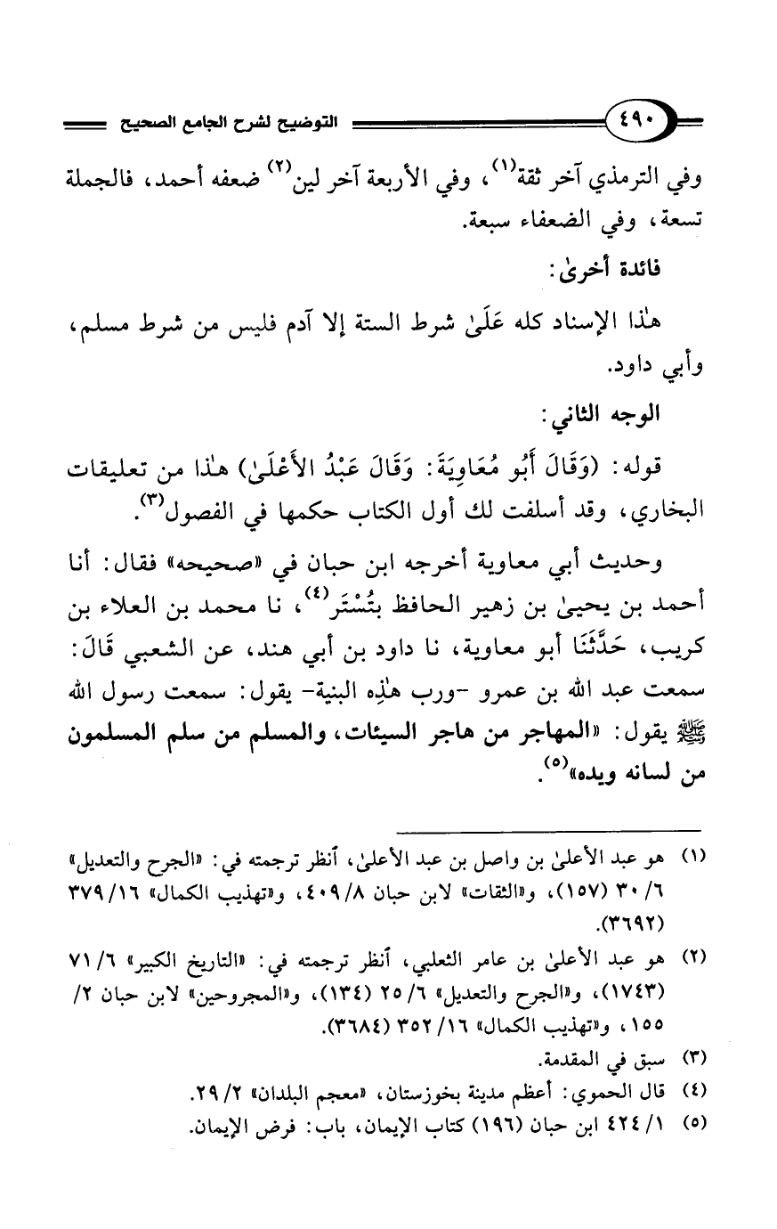 وحديث أبي معاوية أخرجه ابن حبان في "صحيحه" فقال: أنا أحمد بن يحيى بن زهير الحافظ بتُسْتَر (¬4)، نا محمد بن العلاء بن غريب، حَدَّثَنَا أبو معاوية، نا داود بن أبي هند، عن الشعبي قَالَ: سمعت عبد الله بن عمرو -ورب هذِه البنية- يقول: سمعت رسول الله - صلى الله عليه وسلم - يقول: "المهاجر من هاجر السيئات، والمسلم من سلم المسلمون من لسانه ويده" (¬5).