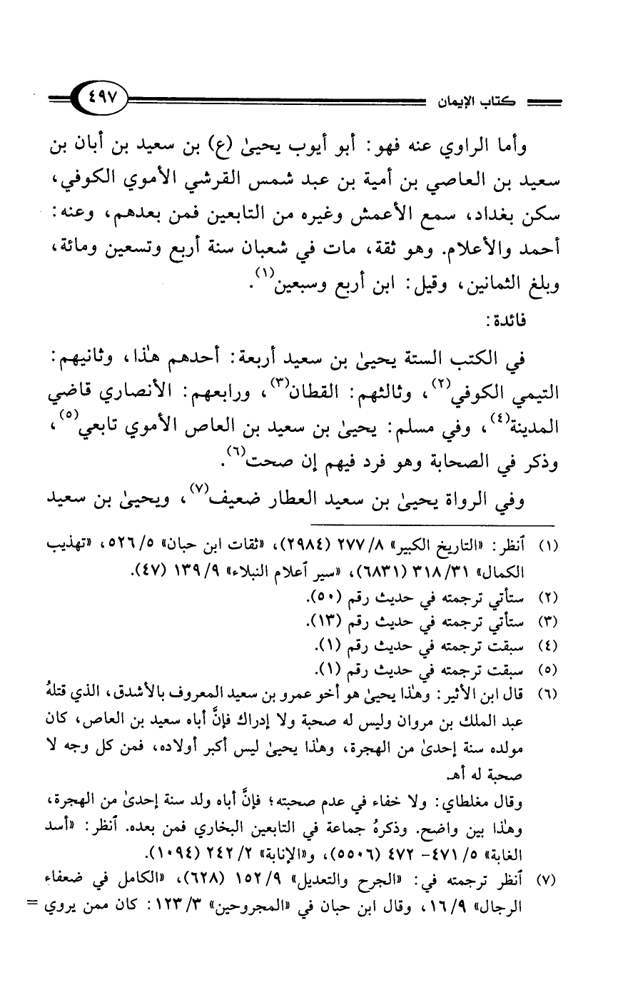 في الكتب الستة يحيى بن سعيد أربعة: أحدهم هذا، وثانيهم: التيمي الكوفي (¬2)، وثالثهم: القطان (¬3)، ورابعهم: الأنصاري قاضي المدينة (¬4)، وفي مسلم: يحيى بن سعيد بن العاص الأموي تابعي (¬5)، وذكر في الصحابة وهو فرد فيهم إن صحت (¬6).