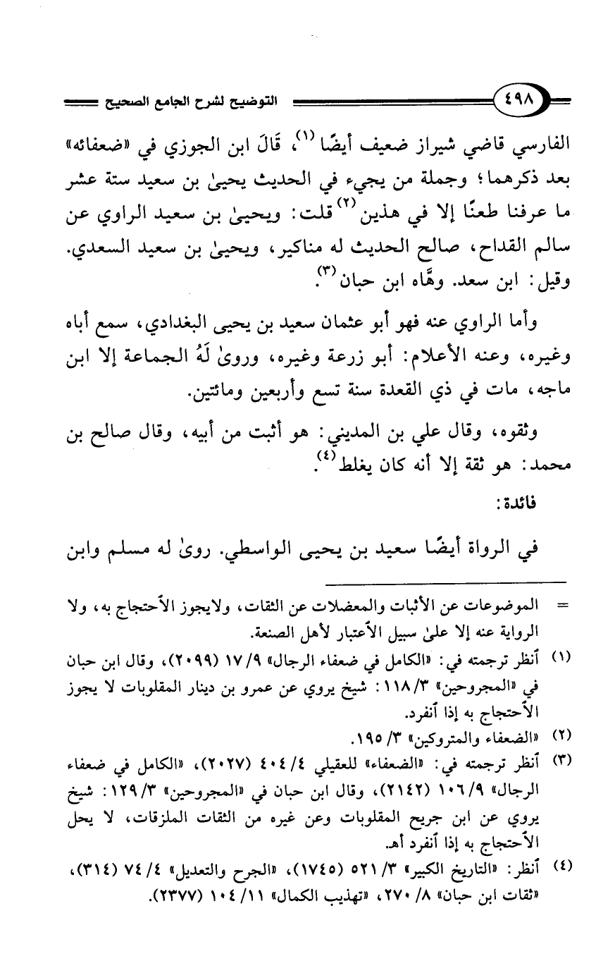 الفارسي قاضي شيراز ضعيف أيضًا (¬1)، قَالَ ابن الجوزي في "ضعفائه" بعد ذكرهما؛ وجملة من يجيء في الحديث يحيى بن سعيد ستة عشر ما عرفنا طعنًا إلا في هذين (¬2) قلت: ويحيى بن سعيد الراوي عن سالم القداح، صالح الحديث له مناكير، ويحيى بن سعيد السعدي. وقيل: ابن سعد. وهَّاه ابن حبان (¬3).