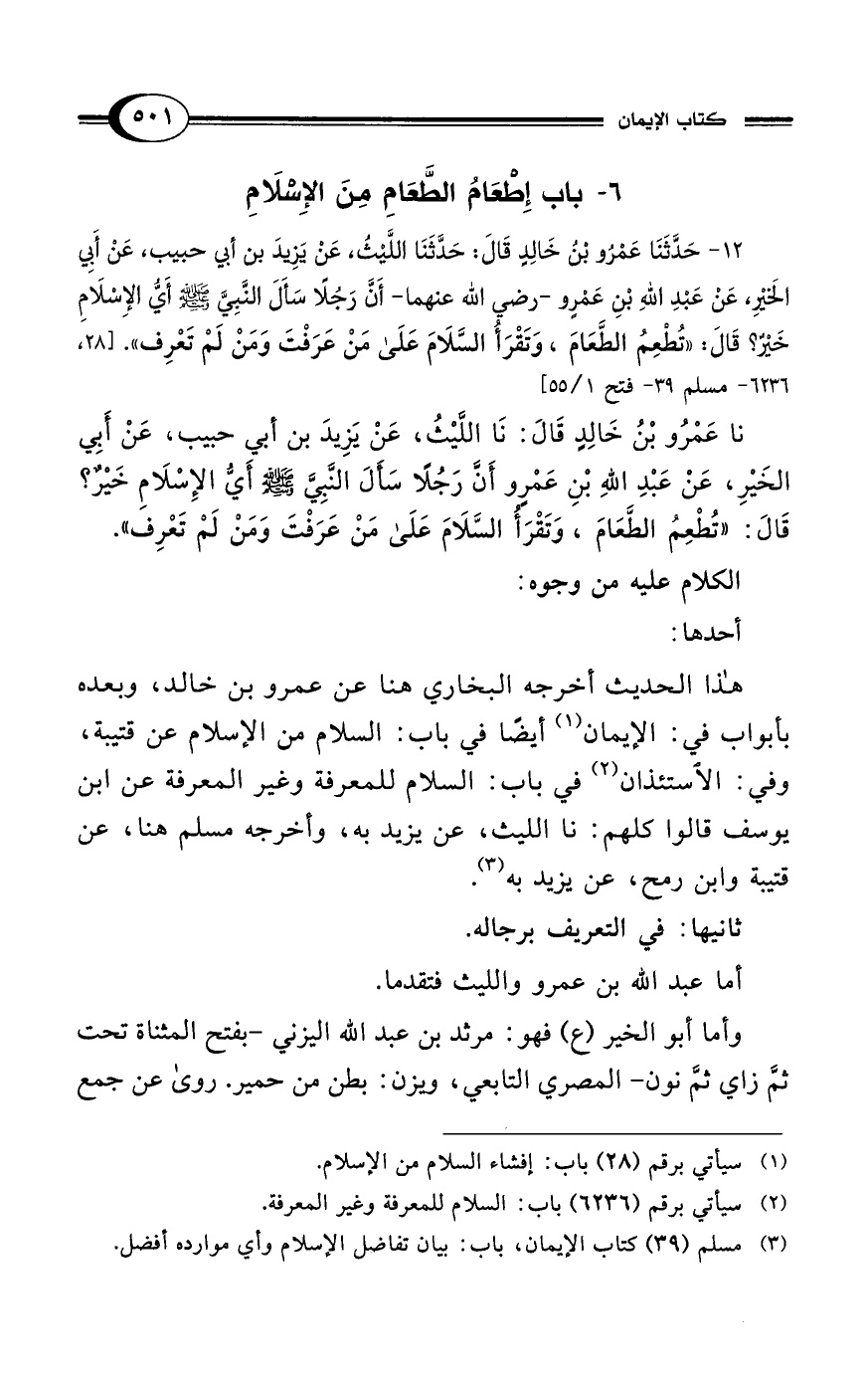 12 - حَدَّثَنَا عَمْرُو بْنُ خَالِدٍ قَالَ: حَدَّثَنَا اللَّيْثُ، عَنْ يَزِيدَ عَنْ أَبِى الْخَيْرِ، عَنْ عَبْدِ اللهِ بْنِ عَمْرٍو - رضى الله عنهما - أَنَّ رَجُلاً سَأَلَ النَّبِىَّ - صلى الله عليه وسلم - أَىُّ الإِسْلاَمِ خَيْرٌ؟ قَالَ: "تُطْعِمُ الطَّعَامَ، وَتَقْرَأُ السَّلاَمَ عَلَى مَنْ عَرَفْتَ وَمَنْ لَمْ تَعْرِفْ". [28، 6236 - مسلم 39 - فتح 1/ 55]