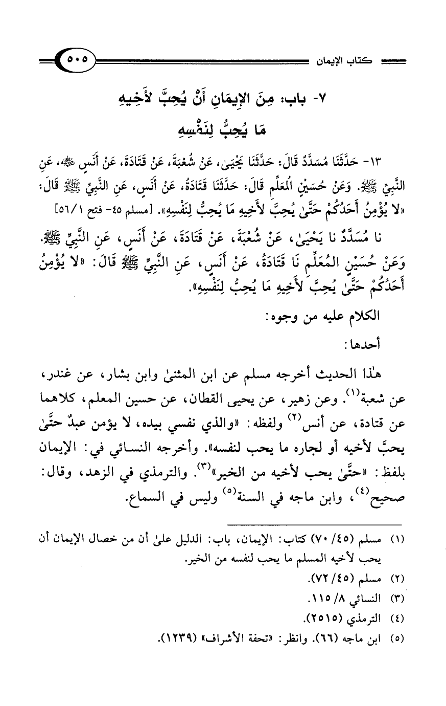 13 - حَدَّثَنَا مُسَدَّدٌ قَالَ: حَدَّثَنَا يَحْيَى، عَنْ شُعْبَةَ، عَنْ قَتَادَةَ، عَنْ أَنَسٍ - رضى الله عنه -، عَنِ النَّبِىِّ - صلى الله عليه وسلم -. وَعَنْ حُسَيْنٍ المُعَلِّمِ قَالَ: حَدَّثَنَا قَتَادَةُ، عَنْ أَنَسٍ، عَنِ النَّبِىِّ - صلى الله عليه وسلم - قَالَ: "لا يُؤْمِنُ أَحَدُكُمْ حَتَّى يُحِبَّ لأَخِيهِ مَا يُحِبُّ لِنَفْسِهِ". [مسلم 45 - فتح 1/ 56]