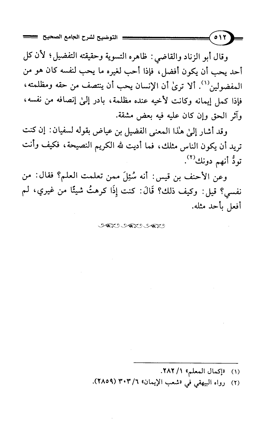 وقد أشار إلى هذا المعنى الفضيل بن عياض بقوله لسفيان: إن كنت تريد أن يكون الناس مثلك، فما أديت لله الكريم النصيحة، فكيف وأنت تودُّ أنهم دونك (¬2).