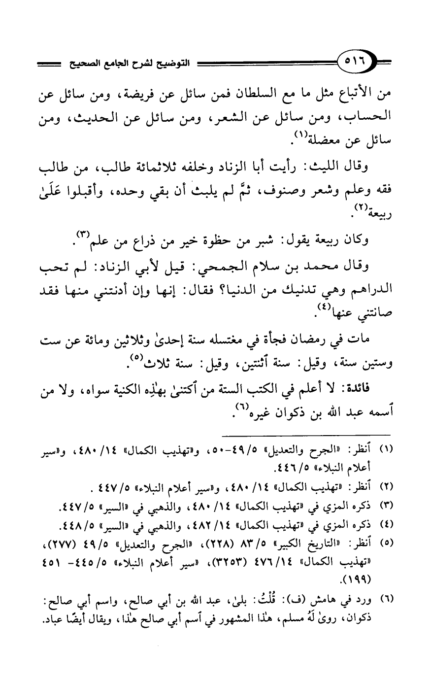 (¬6) ورد في هامش (ف): قُلْتُ: بلى، عبد الله بن أبي صالح، واسم أبي صالح: ذكوان، روى لَهُ مسلم، هذا المشهور في اسم أبي صالح هذا، ويقال أيضًا عباد.