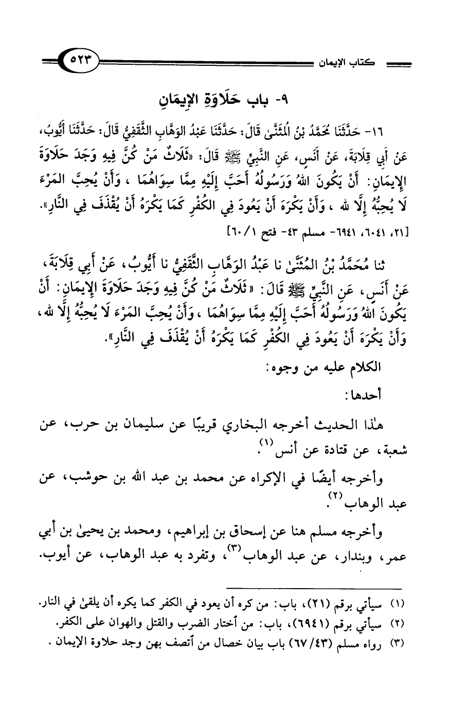 16 - حَدَّثَنَا مُحَمَّدُ بْنُ الْمُثَنَّى قَالَ: حَدَّثَنَا عَبْدُ الْوَهَّابِ الثَّقَفِىُّ قَالَ: حَدَّثَنَا أَيُّوبُ عَنْ أَبِى قِلاَبَةَ، عَنْ أَنَسٍ، عَنِ النَّبِىِّ - صلى الله عليه وسلم - قَالَ: "ثَلاَثٌ مَنْ كُنَّ فِيهِ وَجَدَ حَلاَوَةَ الإِيمَانِ: أَنْ يَكُونَ اللهُ وَرَسُولُهُ أَحَبَّ إِلَيْهِ مِمَّا سِوَاهُمَا، وَأَنْ يُحِبَّ الْمَرْءَ لاَ يُحِبُّهُ إِلاَّ للهِ، وَأَنْ يَكْرَهَ أَنْ يَعُودَ فِي الْكُفْرِ كَمَا يَكْرَهُ أَنْ يُقْذَفَ فِي النَّارِ". [21، 6041، 6941 - مسلم 43 - فتح 1/ 60]