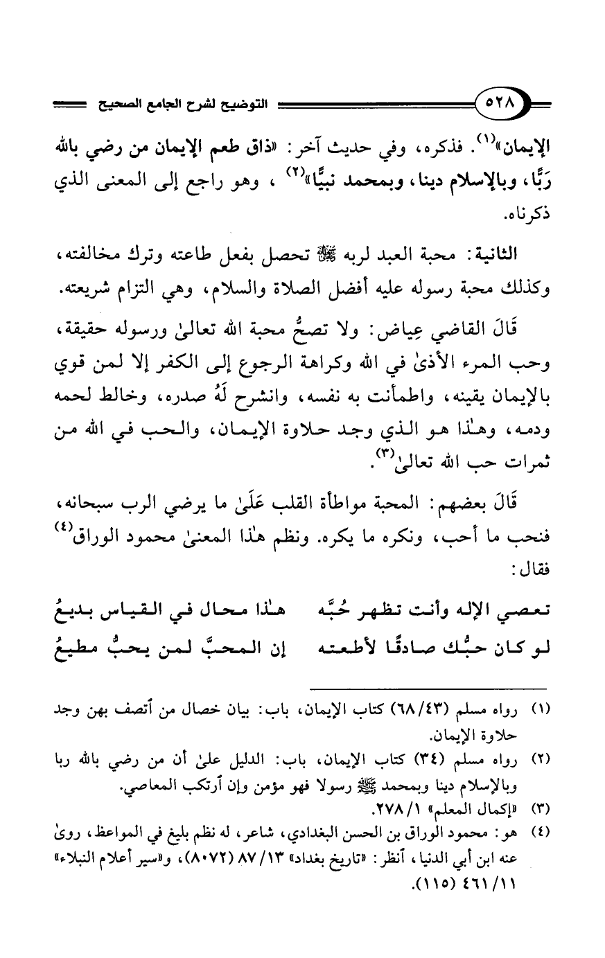 قَالَ القاضي عِياض: ولا تصحُّ محبة الله تعالى ورسوله حقيقة، وحب المرء الأذى في الله وكراهة الرجوع إلى الكفر إلا لمن قوي بالإيمان يقينه، واطمأنت به نفسه، وانشرح لَهُ صدره، وخالط لحمه ودمه، وهذا هو الذي وجد حلاوة الإيمان، والحب في الله من ثمرات حب الله تعالى (¬3).