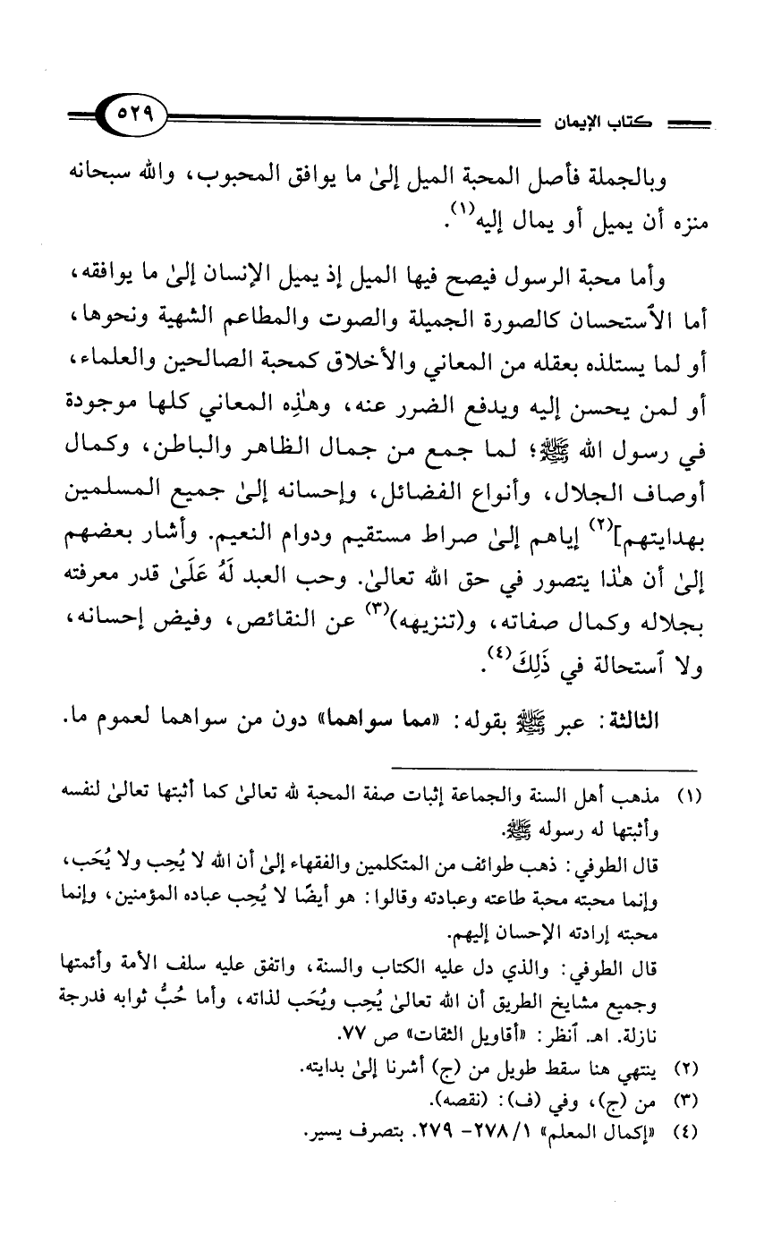 وأما محبة الرسول فيصح فيها الميل إذ يميل الإنسان إلى ما يوافقه، أما الاستحسان كالصورة الجميلة والصوت والمطاعم الشهية ونحوها، أو لما يستلذه بعقله من المعاني والأخلاق كمحبة الصالحين والعلماء، أو لمن يحسن إليه ويدفع الضرر عنه، وهذِه المعاني كلها موجودة في رسول الله - صلى الله عليه وسلم -؛ لما جمع من جمال الظاهر والباطن، وكمال أوصاف الجلال، وأنواع الفضائل، وإحسانه إلى جميع المسلمين بهدايتهم] (¬2) إياهم إلى صراط مستقيم ودوام النعيم. وأشار بعضهم إلى أن هذا يتصور في حق الله تعالى. وحب العبد لَهُ عَلَى قدر معرفته بجلاله وكمال صفاته، و (تنزيهه) (¬3) عن النقائص، وفيض إحسانه، ولا استحالة في ذَلِكَ (¬4).