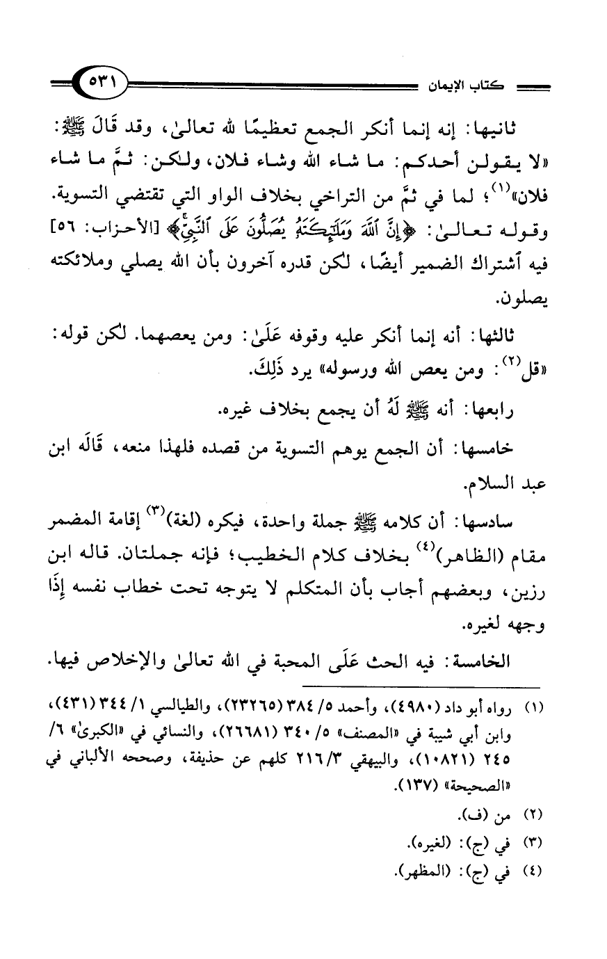 ثانيها: إنه إنما أمر الجمع تعظيمًا لله تعالى، وقد قَالَ - صلى الله عليه وسلم -: "لا يقولن أحدكم: ما شاء الله وشاء فلان، ولكن: ثمَّ ما شاء فلان" (¬1)؛ لما في ثمَّ من التراخي بخلاف الواو التي تقتضي التسوية.