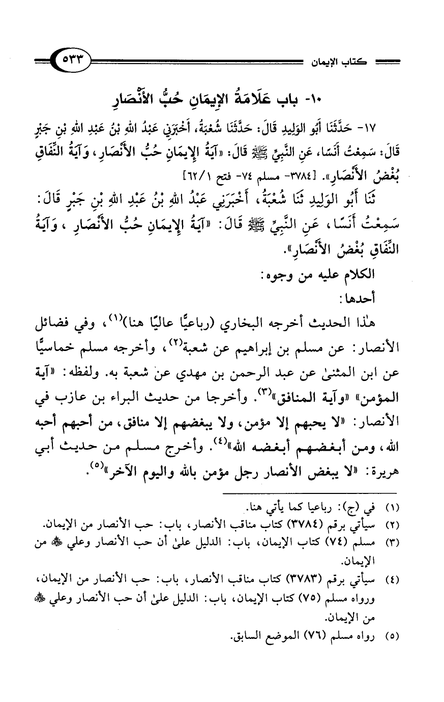 17 - حَدَّثَنَا أَبُو الْوَلِيدِ قَالَ: حَدَّثَنَا شُعْبَةُ، أَخْبَرَنِى عَبْدُ اللهِ بْنُ عَبْدِ اللهِ بْنِ جَبْرٍ قَالَ: سَمِعْتُ أَنَسًا، عَنِ النَّبِيِّ - صلى الله عليه وسلم - قَالَ: "آيَةُ الإِيمَانِ حُبُّ الأَنْصَارِ، وَآيَةُ النِّفَاقِ بُغْضُ الأَنْصَارِ". [3784 - مسلم 74 - فتح 1/ 62]