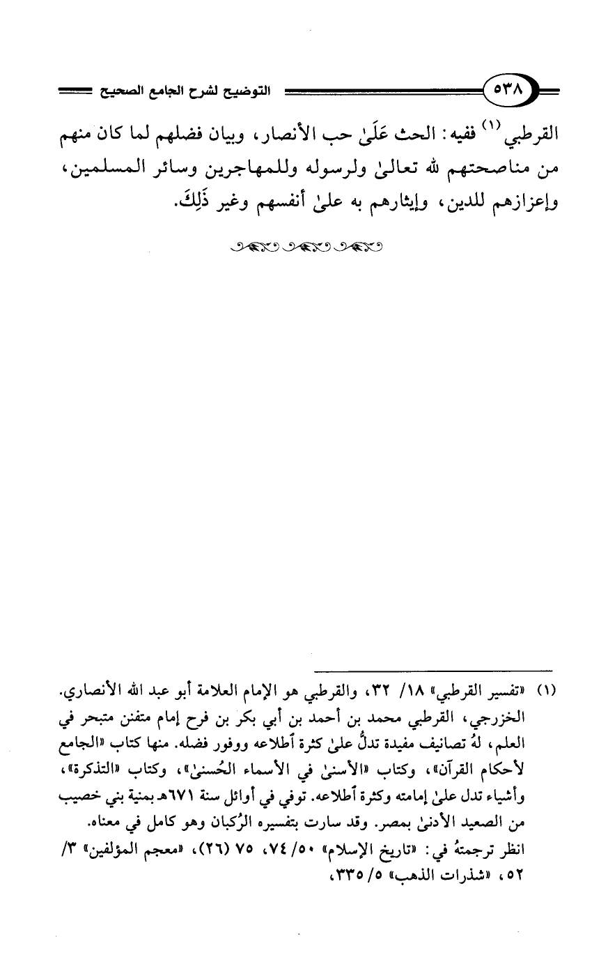 (¬1) "تفسير القرطبي" 18/ 32، والقرطبي هو الإمام العلامة أبو عبد الله الأنصاري. الخزرجي، القرطبي محمد بن أحمد بن أبي بكر بن فرح إمام متفنن متبحر في العلم، لهُ تصانيف مفيدة تدلُّ على كثرة اطلاعه ووفور فضله. منها كتاب "الجامع لأحكام القرآن"، وكتاب "الأسنى في الأسماء الحُسنى"، وكتاب "التذكرة"، وأشياء تدل على إمامته وكثرة اطلاعه. توفي في أوائل سنة 671 هـ بمنية بني خصيب من الصعيد الأدنى بمصر. وقد سارت بتفسيره الرُكبان وهو كامل في معناه.