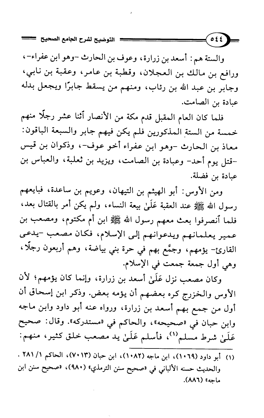 والستة هم: أسعد بن زرارة، وعوف بن الحارث-وهو ابن عفراء-، ورافع بن مالك بن العجلان، وقطبة بن عامر، وعقبة بن نابي، وجابر بن عبد الله بن رئاب، ومنهم من يسقط جابرًا ويجعل بدله عبادة بن الصامت.