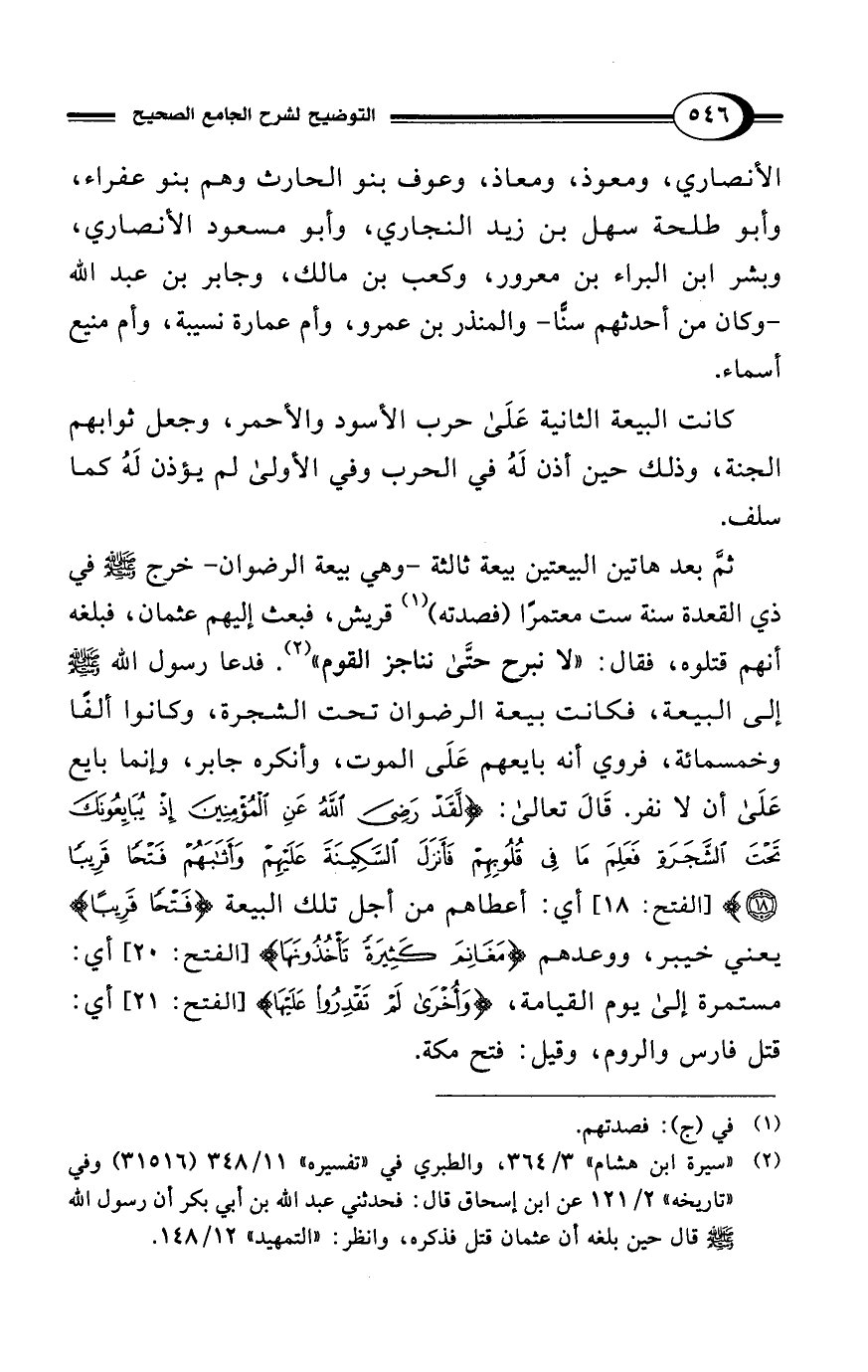 (¬2) "سيرة ابن هشام" 3/ 364، والطبري في "تفسيره" 11/ 348 (31516) وفي "تاريخه" 2/ 121 عن ابن إسحاق قال: فحدثني عبد الله بن أبي بكر أن رسول الله - صلى الله عليه وسلم - قال حين بلغه أن عثمان قتل فذكره، وانظر: "التمهيد" 12/ 148.