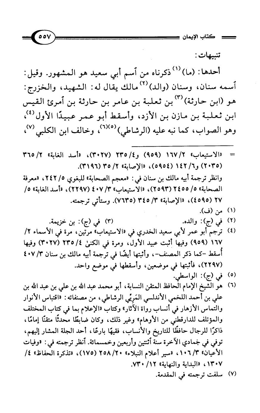 (¬4) ترجم أبو عمر لأبي سعيد الخدري في "الاستيعاب" مرتين، مرة في الأسماء 2/ 167 (959) وفيها أثبت عبيد الأول، ومرة في الكنى 4/ 235 (3027) وفيها أُسقط -كما ذكر المصنف-، وأثبتها أيضًا في ترجمة أبيه مالك بن سنان 3/ 407 (2297)، فأثبتها في موضعين، وأسقطها في موضع واحد.