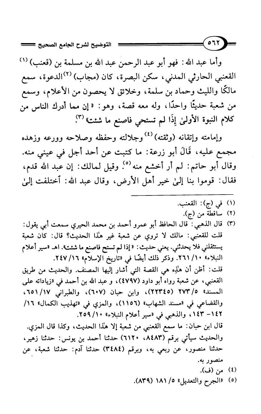 (¬3) قال الذهبي: قال الحافظ أبو عمرو أحمد بن محمد الحيري سمعت أبي يقول: قلت للقعنبي: مالك لا تروي عن شعبة غير هذا الحديث؟ قال: كان شعبة يستثقلني فلا يحدثني. يعني حديث: "إذا لم تستح فاصنع ما شئت". اهـ. "سير أعلام النبلاء" 10/ 261. وذكر ذلك أيضًا في "تاريخ الإسلام " 16/ 247.