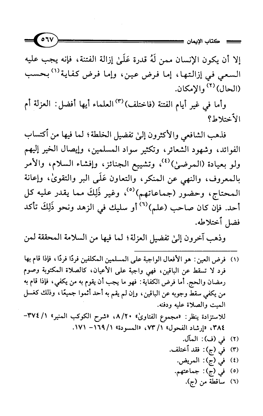 فذهب الشافعي والأكثرون إلى تفضيل الخلطة؛ لما فيها من اكتساب الفوائد، وشهود الشعائر، وتكثير سواد المسلمين، وإيصال الخير إليهم ولو بعيادة (المرضى) (¬4)، وتشييع الجنائز، وإفشاء السلام، والأمر بالمعروف، والنهي عن المنكر، والتعاون عَلَى البر والتقوى، وإعانة المحتاج، وحضور (جماعاتهم) (¬5)، وغير ذَلِكَ مما يقدر عليه كل أحد. فإن كان صاحب (علم) (¬6) أو سليك في الزهد ونحو ذَلِكَ تأكد فضل اختلاطه.