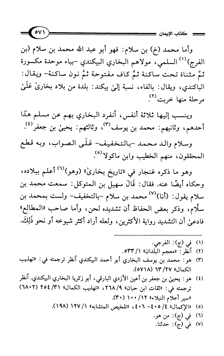 وسلام والد محمد -بالتخفيف- عَلَى الصواب، وبه قطع المحققون، منهم الخطيب وابن ماكولا (¬5).