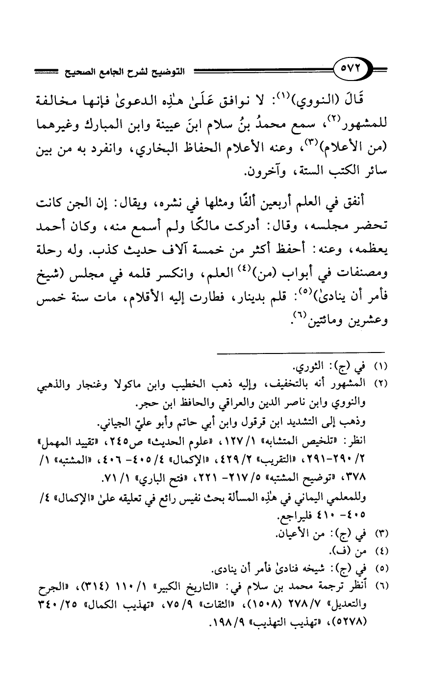 (¬6) انظر ترجمة محمد بن سلام في: "التاريخ الكبير" 1/ 110 (314)، "الجرح والتعديل" 7/ 278 (1508)، "الثقات" 9/ 75، "تهذيب الكمال" 25/ 340 (5278)، "تهذيب التهذيب" 9/ 198.