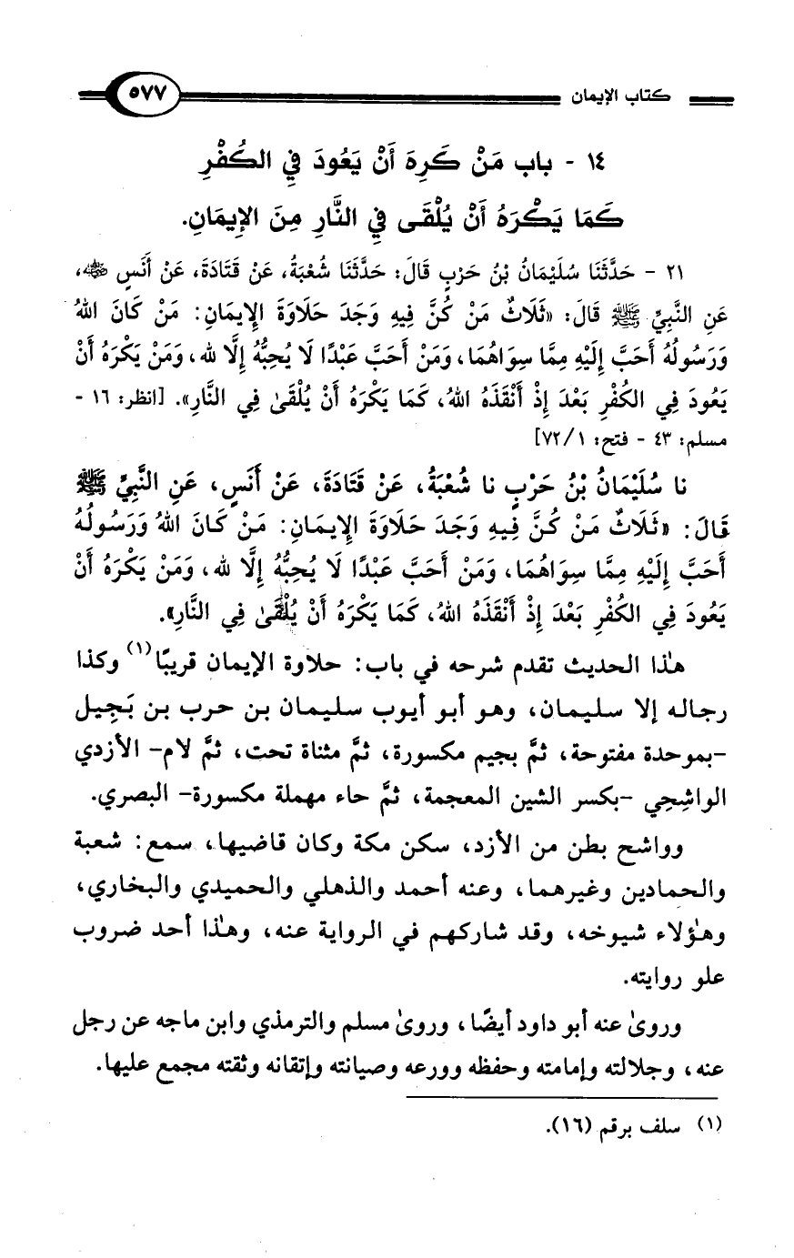 نا سُليمَانُ بْنُ حَرْبٍ نا شُعْبَةُ، عن قَتَادَةَ، عَنْ أنَسٍ، عَنِ النَّبِيِّ - صلى الله عليه وسلم - قالَ: "ثَلَاثٌ مَنْ كُنَّ فِيهِ وَجَدَ حَلَاوَةَ الإِيمَانِ: مَنْ كَانَ اللهُ وَرَسُولُهُ أَحَبَّ إِلَيْهِ مِمَّا سِوَاهُمَا، وَمَنْ أَحَبَّ عَبْدًا لَا يُحِبُّهُ إِلَّا لله، وَمَنْ يَكْرَهُ أَنْ يَعُودَ فِي الكُفْرِ بَعْدَ إِذْ أَنْقَذَهُ اللهُ، كمَا يَكْرَهُ أَنْ يُلقى فِي النَّار".