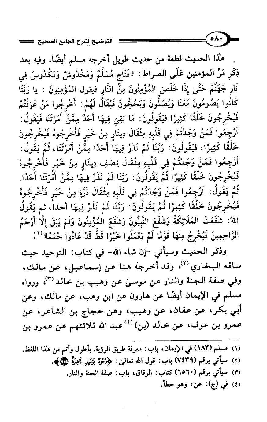 هذا الحديث قطعة من حديث طويل أخرجه مسلم أيضًا. وفيه بعد ذِكرِ مَرِّ المؤمنين عَلَى الصراط: "فَنَاجٍ مُسَلَّمٌ وَمَخْدُوشٌ وَمَكْدُوسٌ فِي نَارِ جَهَنَّمَ حَتَّى إِذَا خَلَصَ المُؤْمِنُونَ مِنْ النَّارِ فيقول المُؤْمِنِونَ: يا رَبَّنَا كَانُوا يَصُومُونَ مَعَنَا وَيُصَلُّونَ وَيَحُجُّونَ فَيُقَالُ لَهُمْ: أَخْرِجُوا مَنْ عَرَفْتُمْ فَيُخْرِجُونَ خَلْقًا كَثِيرًا فيَقُولُونَ: مَا بَقِيَ فِيهَا أَحَدٌ مِمَّنْ أَمَرْتَنَا فَيَقُولُ: ارْجِعُوا فَمَنْ وَجَدْتُمْ فِي قَلْبِهِ مِثْقَالَ دِينَارٍ مِنْ خَيْرٍ فَأَخْرِجُوهُ فَيُخْرِجُونَ خَلْقًا كثِيرًا، فيَقُولُونَ: رَبَّنَا لَمْ نَذَرْ فِيهَا أَحَدًا مِمَّنْ أَمَرْتَنَا، ثُمَّ يَقُولُ: ارْجِعُوا فَمَنْ وَجَدْتُمْ فِي قَلْبِهِ مِثْقَالَ نِصْفِ دِينَارٍ مِنْ خَيْرٍ فَأَخْرِجُوهُ فَيُخْرِجُونَ خَلْقًا كثِيرًا ثُمَّ يَقُولُونَ: رَبَّنَا لَمْ نَذَرْ فِيهَا مِمَّنْ أَمَرْتَنَا أَحَدًا. ثُمَّ يَقُولُ: ارْجِعُوا فَمَنْ وَجَدْتُمْ فِي قَلْبِهِ مِثْقَالَ ذَرَّةٍ مِنْ خَيْرٍ فَأَخْرِجُوهُ فَيُخْرِجُونَ خَلْقًا كثِيرًا ثُمَّ يَقُولُونَ: رَبَّنَا لَمْ نَذَرْ فِيهَا أحدا، ثم يَقُولُ اللهُ: شَفَعَتْ المَلَائِكَةُ وَشَفَعَ النَّبِيُّونَ وَشَفَعَ المُؤْمِنُونَ وَلَمْ يَبْقَ إِلَّا أَرْحَمُ الرَّاحِمِينَ فَيُخْرِجُ مِنْهَا قَوْمًا لَمْ يَعْمَلُوا خَيْرًا قَطُّ قَدْ عَادُوا حُمَمًا" (¬1).
