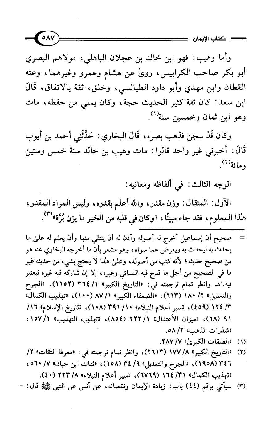 وأما وهيب: فهو ابن خالد بن عجلان الباهلي، مولاهم البصري أبو بكر صاحب الكرابيس، روى عن هشام وعمرو وغيرهما، وعنه القطان وابن مهدي وأبو داود الطيالسي، وخلق، ثقة بالاتفاق، قَالَ ابن سعد: كان ثقة كثير الحديث حجة، وكان يملي من حفظه، مات وهو ابن ثمان وخمسين سنة (¬1).