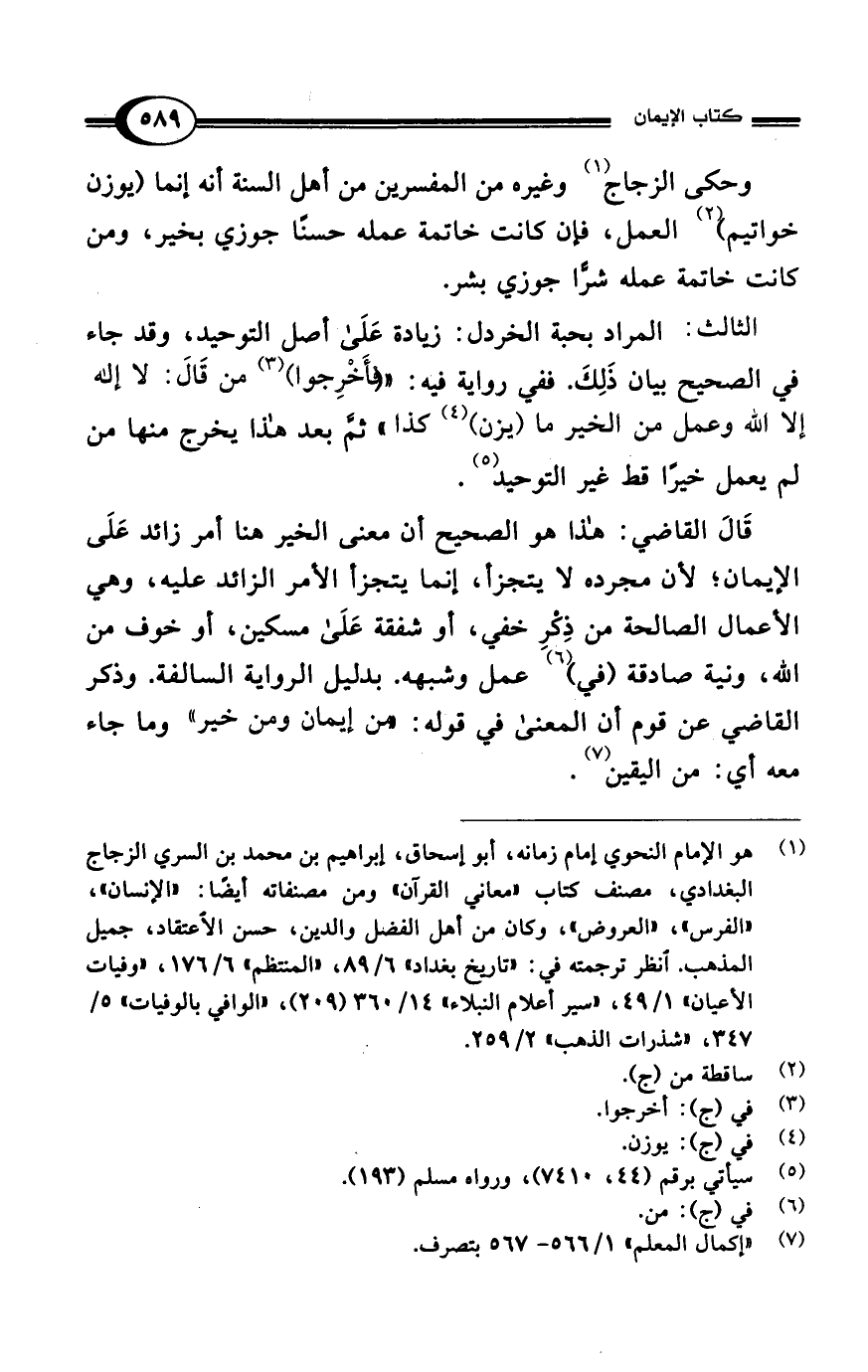 (¬1) هو الإمام النحوي إمام زمانه، أبو إسحاق، إبراهيم بن محمد بن السري الزجاج البغدادي، مصنف كتاب "معاني القرآن" ومن مصنفاته أيضًا: "الإنسان"، "الفرس"، "العروض"، وكان من أهل الفضل والدين، حسن الاعتقاد، جميل المذهب. انظر ترجمته في: "تاريخ بغداد" 6/ 89، "المنتظم" 6/ 176، "وفيات الأعيان" 1/ 49، "سير أعلام النبلاء" 14/ 360 (209)، "الوافي بالوفيات" 5/ 347، "شذرات الذهب" 2/ 259.
