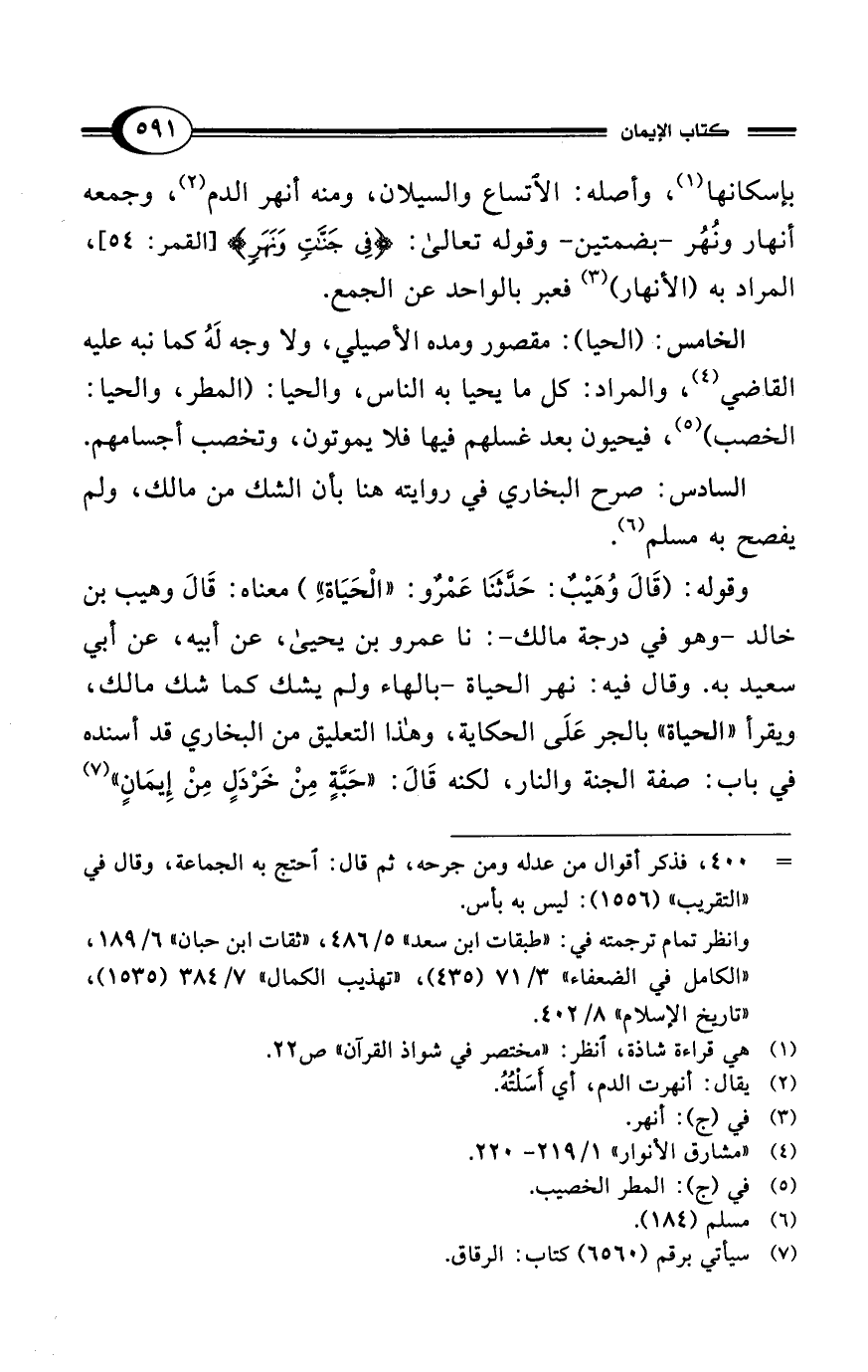 وقوله: (قَالَ وُهَيْبٌ: حَدَّثنَا عَمْرٌو: "الْحَيَاة" معناه: قَالَ وهيب بن خالد -وهو في درجة مالك-: نا عمرو بن يحيى، عن أبيه، عن أبي سعيد به. وقال فيه: نهر الحياة -بالهاء ولم يشك كما شك مالك، ويقرأ "الحياة" بالجر عَلَى الحكاية، وهذا التعليق من البخاري قد أسنده في باب: صفة الجنة والنار، لكنه قَالَ: "حَبَّةٍ مِنْ خَرْدَلٍ مِنْ إِيمَانٍ" (¬7)