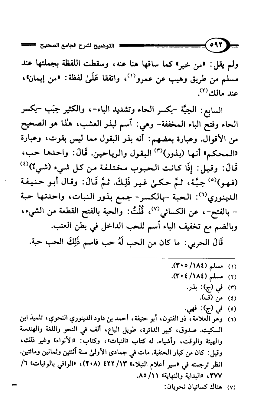 السابع: الحِبَّة -بكسر الحاء وتشديد الباء-، والكثير حِبَب -بكسر الحاء وفتح الباء المخففة- وهي: اسم لبذر العشب، هذا هو الصحيح من الأقوال. وعبارة بعضهم: أنه بذر البقول مما ليس بقوت، وعبارة "المحكم" أنها (بذور) (¬3) البقول والرياحين. قَالَ: واحدها حب، قَالَ: وقيل: إِذَا كانت الحبوب مختلفة من كل شيء (شىءٌ) (¬4) (فهو) (¬5) حِبَّة، ثمَّ حكى غير ذَلِكَ. ثمَّ قَالَ: وقال أبو حنيفة الدينوري (¬6): الحبة -بالكسر- جمع بذور النبات، واحدتها حبة -بالفتح-، عن الكسائي (¬7)، قُلْتُ: والحبة بالفتح القطعة من الشيء، وبالضم مع تخفيف الباء اسم للحب الداخل في بطن العنب.