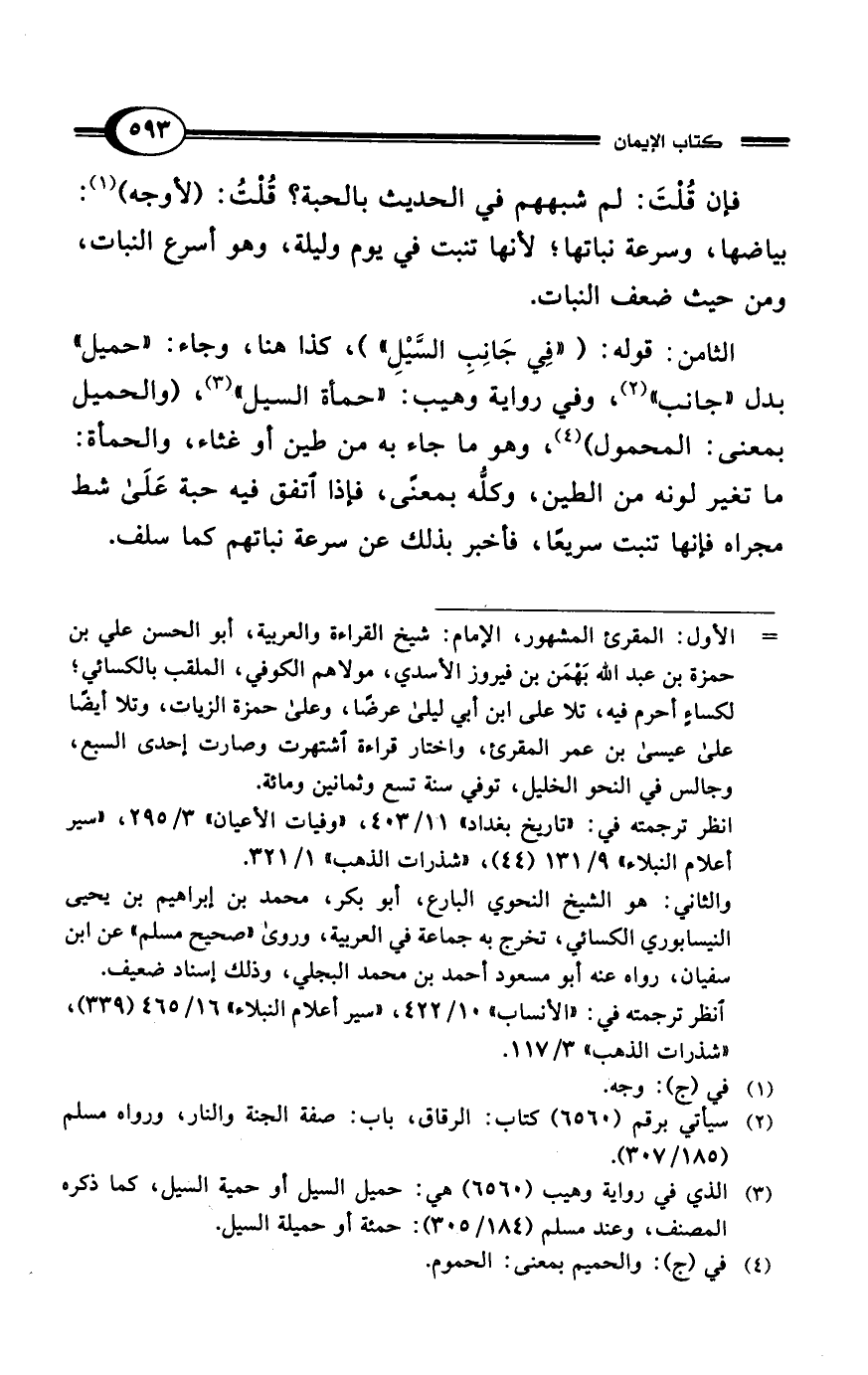 الثامن: قوله: ("فِي جَانِبِ السَّيْلِ")، كذا هنا، وجاء: "حميل" بدل "جانب " (¬2)، وفي رواية وهيب: "حمأة السيل" (¬3)، (والحميل بمعنى: المحمول) (¬4)، وهو ما جاء به من طين أو غئاء، والحمأة: ما تغير لونه من الطين، وكلُّه بمعنًى، فإذا اتفق فيه حبة عَلَى شط مجراه فإنها تنبت سريعًا، فأخبر بذلك عن سرعة نباتهم كما سلف.