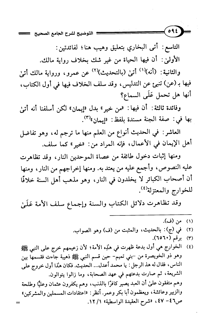 ومنها إثبات دخول طائفة من عصاة الموحدين النار، وقد تظاهرت عليه النصوص، وأجمع عليه من يعتد به. ومنها إخراجهم من النار، ومنها أن أصحاب الكبائر لا يخلدون في النار، وهو مذهب أهل السنة خلافًا للخوارج والمعتزلة (¬4).