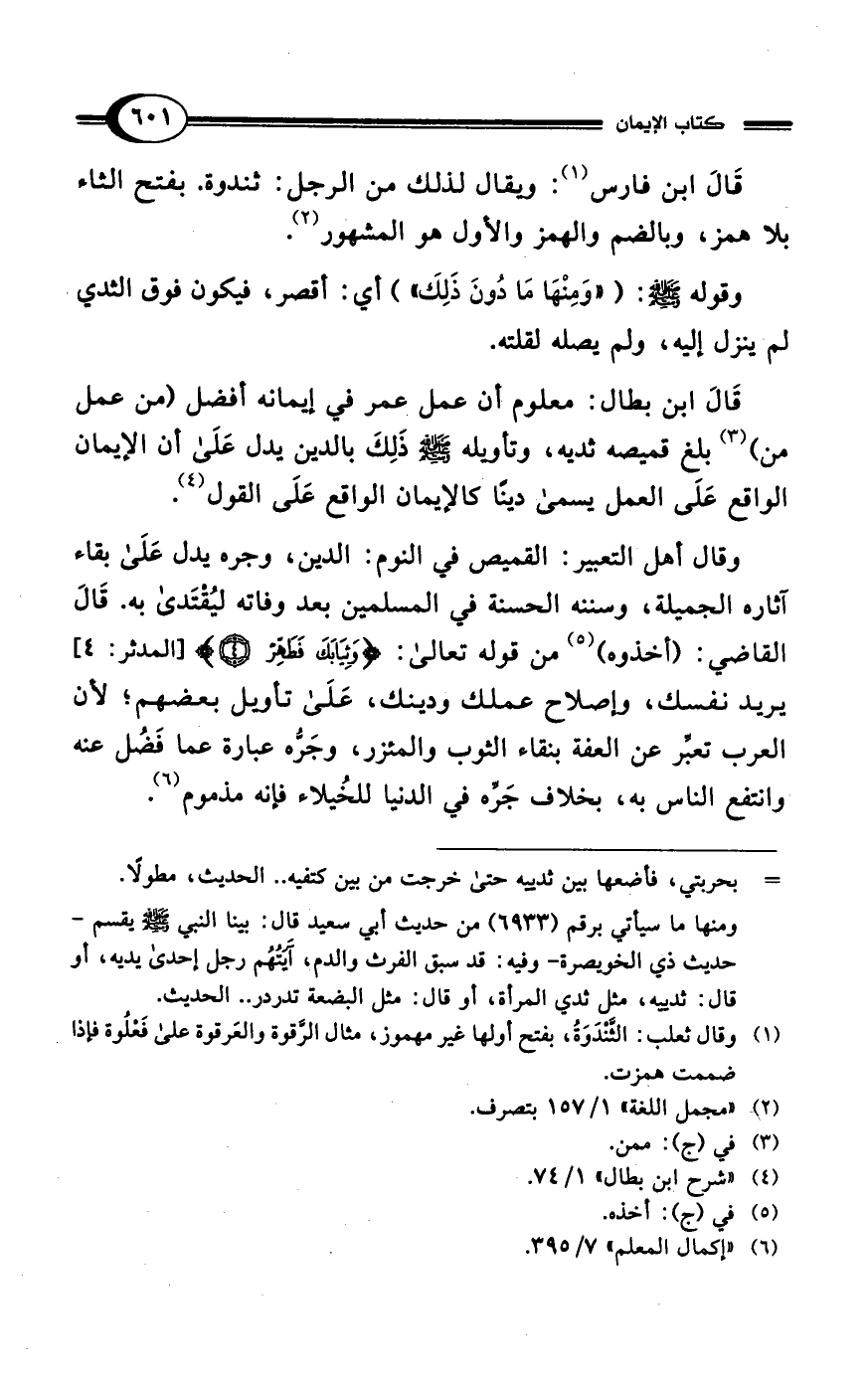 قَالَ ابن بطال: معلوم أن عمل عمر في إيمانه أفضل (من عمل من) (¬3) بلغ قميصه ثديه، وتأويله - صلى الله عليه وسلم - ذَلِكَ بالدين يدل عَلَى أن الإيمان الواقع عَلَى العمل يسمى دينًا كالإيمان الواقع عَلَى القول (¬4).