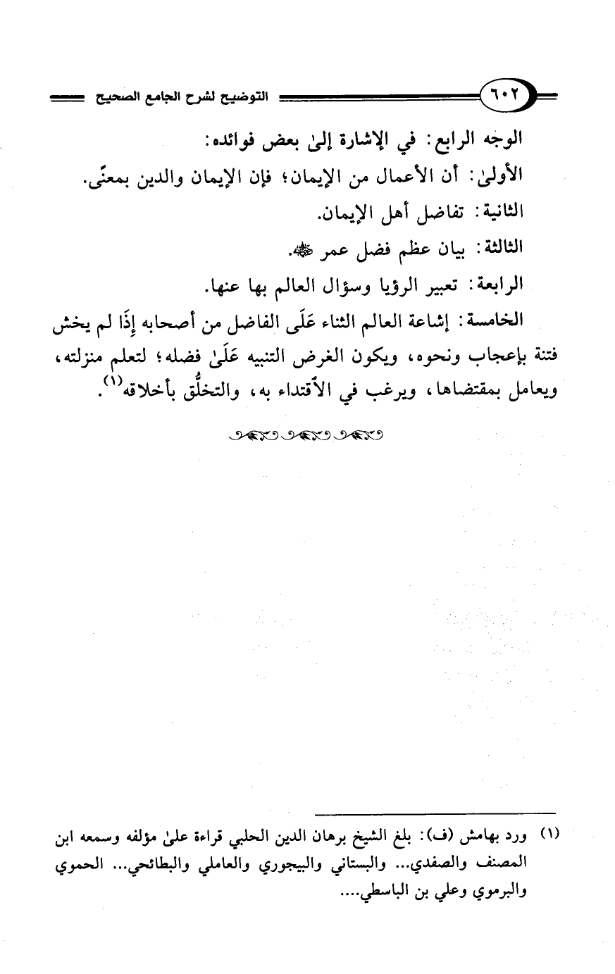 الخامسة: إشاعة العالم الثناء عَلَى الفاضل من أصحابه إِذَا لم يخش فتنة بإعجاب ونحوه، ويكون الغرض التنبيه عَلَى فضله؛ لتعلم منزلته، ويعامل بمقتضاها، ويرغب في الاقتداء به، والتخلُّق بأخلاقه (¬1).