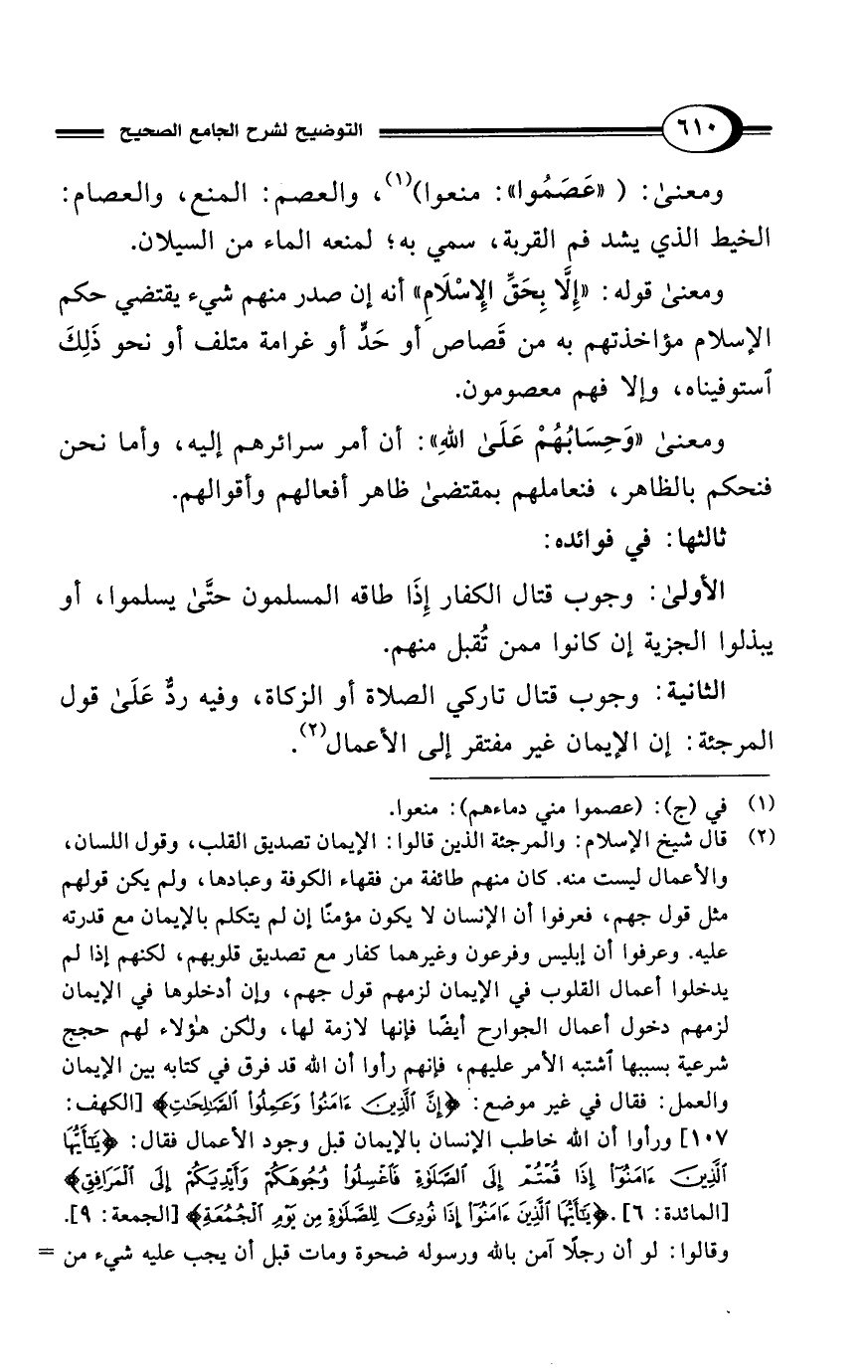 (¬2) قال شيخ الإسلام: والمرجئة الذين قالوا: الإيمان تصديق القلب، وقول اللسان، والأعمال ليست منه. كان منهم طائفة من فقهاء الكوفة وعبادها، ولم يكن قولهم مثل قول جهم، فعرفوا أن الإنسان لا يكون مؤمنًا إن لم يتكلم بالإيمان مع قدرته عليه. وعرفوا أن إبليس وفرعون وغيرهما كفار مع تصديق قلوبهم، لكنهم إذا لم يدخلوا أعمال القلوب في الإيمان لزمهم قول جهم، وإن أدخلوها في الإيمان لزمهم دخول أعمال الجوارح أيضًا فإنها لازمة لها، ولكن هؤلاء لهم حجج شرعية بسببها اشتبه الأمر عليهم، فإنهم رأوا أن الله قد فرق في كتابه بين الإيمان والعمل: فقال في غير موضع: {إِنَّ الَّذِينَ آمَنُوا وَعَمِلُوا الصَّالِحَاتِ} [الكهف: 107] ورأوا أن الله خاطب الإنسان بالإيمان قبل وجود الأعمال فقال: {يَا أَيُّهَا الَّذِينَ آمَنُوا إِذَا قُمْتُمْ إِلَى الصَّلَاةِ فَاغْسِلُوا وُجُوهَكُمْ وَأَيْدِيَكُمْ إِلَى الْمَرَافِقِ} [المائدة: 6]. {يَا أَيُّهَا الَّذِينَ آمَنُوا إِذَا نُودِيَ لِلصَّلَاةِ مِنْ يَوْمِ الْجُمُعَةِ} [الجمعة: 9].