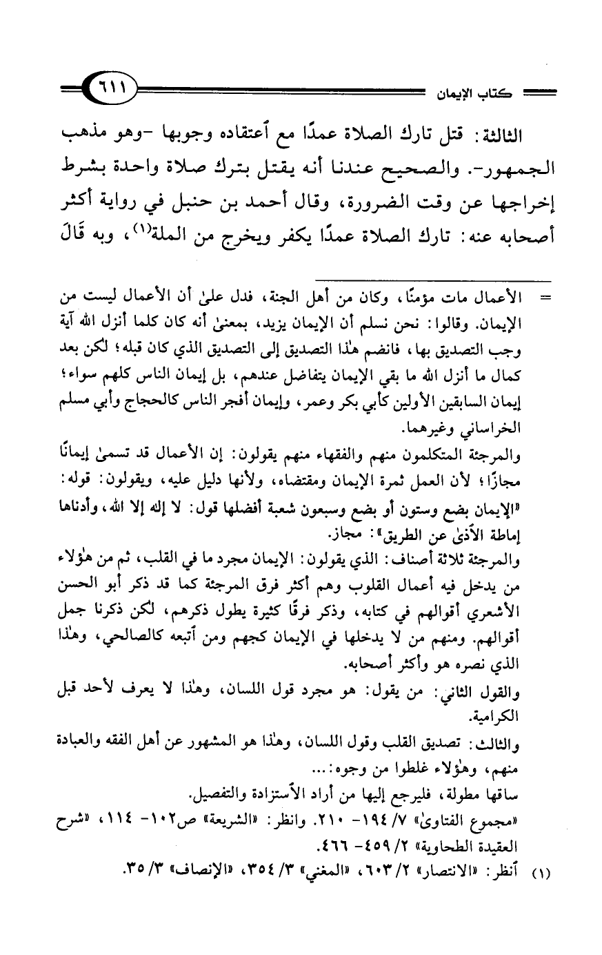 والمرجئة ثلاثة أصناف: الذي يقولون: الإيمان مجرد ما في القلب، ثم من هؤلاء من يدخل فيه أعمال القلوب وهم أكثر فرق المرجئة كما قد ذكر أبو الحسن الأشعري أقوالهم في كتابه، وذكر فرقًا كثيرة يطول ذكرهم، لكن ذكرنا جمل أقوالهم. ومنهم من لا يدخلها في الإيمان كجهم ومن اتبعه كالصالحي، وهذا الذي نصره هو وأكثر أصحابه.