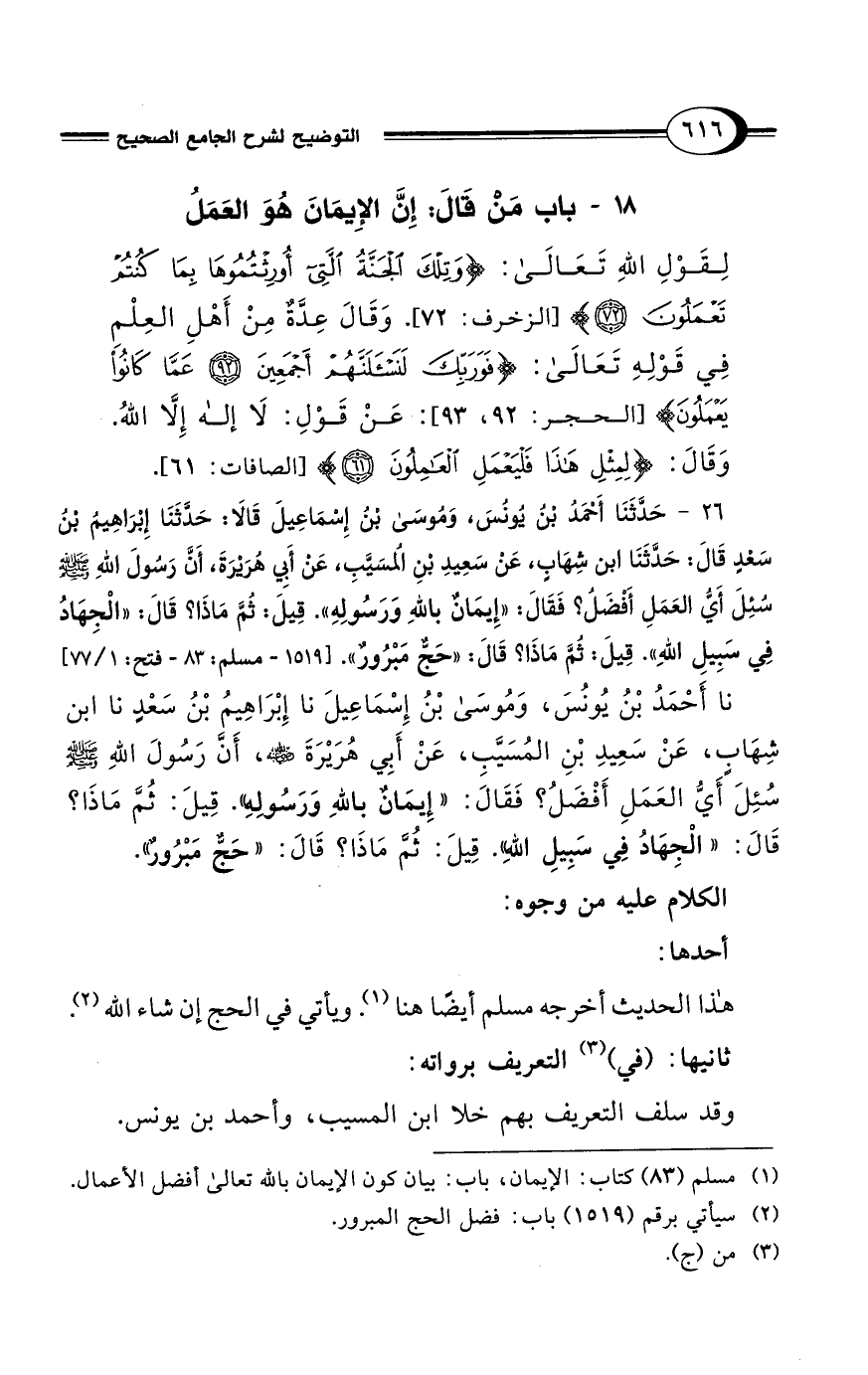 26 - حَدَّثَنَا أَحْمَدُ بْنُ يُونُسَ، وَمُوسَى بْنُ إِسْمَاعِيلَ قَالَا: حَدَّثَنَا إِبْرَاهِيمُ بْنُ سَعْدِ قَالَ: حَدَّثَنَا ابن شِهَابِ، عَنْ سَعِيدِ بْنِ الُمسَيَّبِ، عَن أَبِي هُرَيْرَةَ، أَنَّ رَسُولَ اللهِ - صلى الله عليه وسلم - سُئِلَ أَيُّ العَمَلِ أَفْضَلُ؟ فَقَالَ: "إِيمَانٌ باللهِ وَرَسُولِهِ". قِيلَ: ثُمَّ مَاذَا؟ قَالَ: "الْجِهَادُ فِي سَبِيلِ اللهِ". قِيلَ: ثُمَّ مَاذَا؟ قَالَ: "حَجٌ مَبْرُورٌ". [1519 - مسلم: 83 - فتح: 1/ 77]