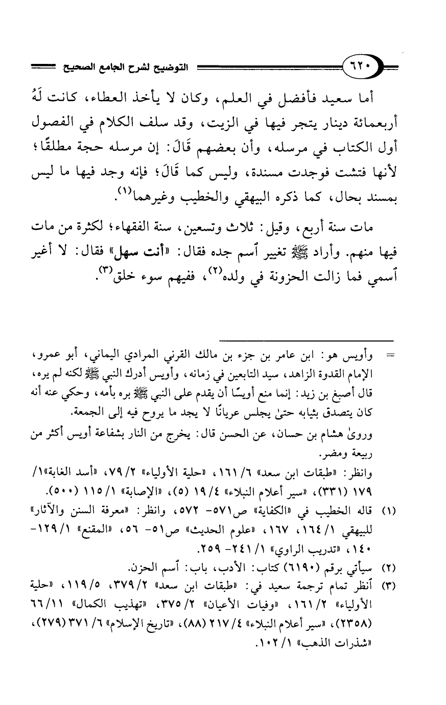 = وأويس هو: ابن عامر بن جزء بن مالك القرني المرادي اليماني، أبو عمرو، الإمام القدوة الزاهد، سيد التابعين في زمانه، وأويس أدرك النبي - صلى الله عليه وسلم - لكنه لم يره، قال أصبغ بن زيد: إنما منع أويسًا أن يقدم على النبي - صلى الله عليه وسلم - بره بأمه، وحكي عنه أنه كان يتصدق بثيابه حتى يجلس عريانًا لا يجد ما يروح فيه إلى الجمعة.