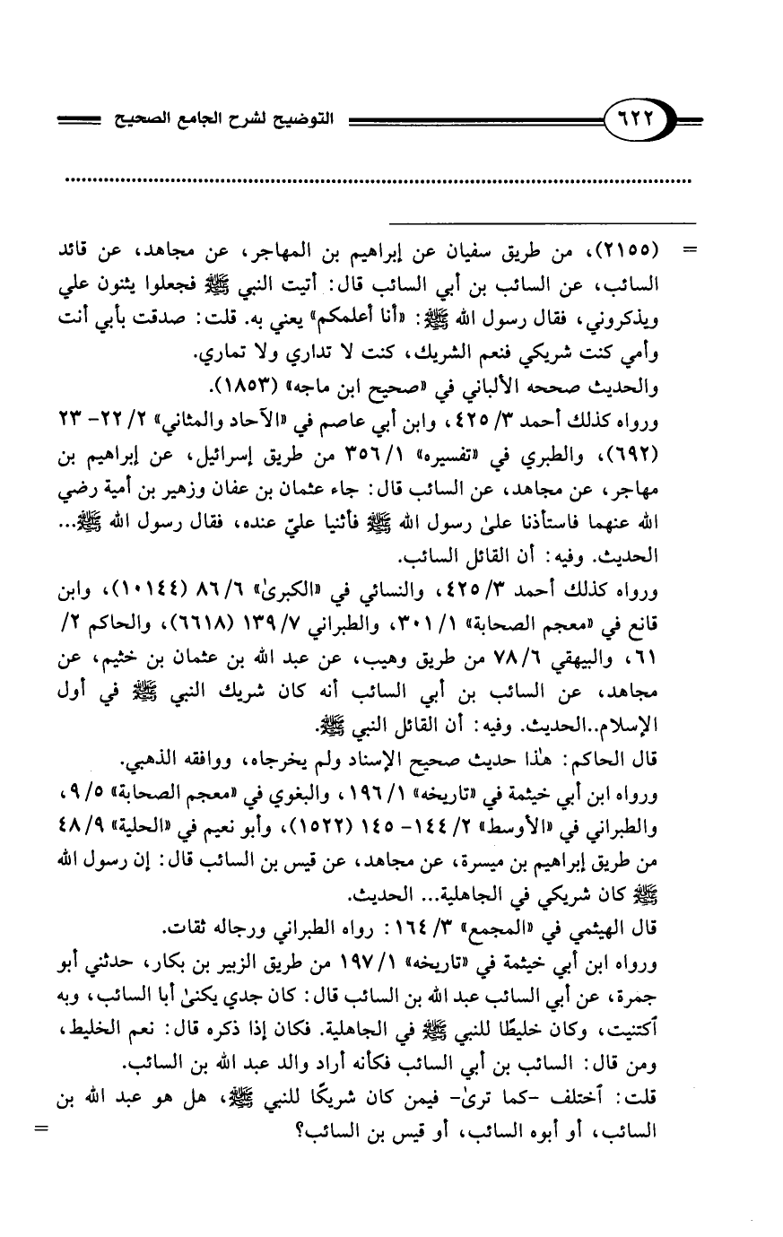= (2155)، من طريق سفيان عن إبراهيم بن المهاجر، عن مجاهد، عن قائد السائب، عن السائب بن أبي السائب قال: أتيت النبي - صلى الله عليه وسلم - فجعلوا يثنون علي ويذكروني، فقال رسول الله - صلى الله عليه وسلم -: "أنا أعلمكم" يعني به. قلت: صدقت بأبي أنت وأمي كنت شريكي فنعم الشريك، كنت لا تداري ولا تماري.