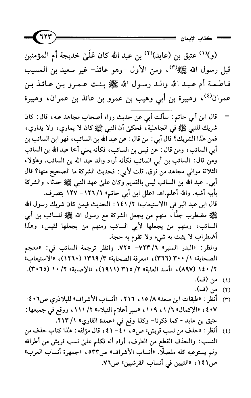 (¬3) انظر: "طبقات ابن سعد" 8/ 15، 216، "أنساب الأشراف" للبلاذري ص 406 - 407، "الإكمال" 6/ 1، 109، "سير أعلام النبلاء" 2/ 111، ووقع في جميعها: عتيق بن عابد -كما ذكرنا- وكذا وقع في "عمدة القاري" 1/ 213.