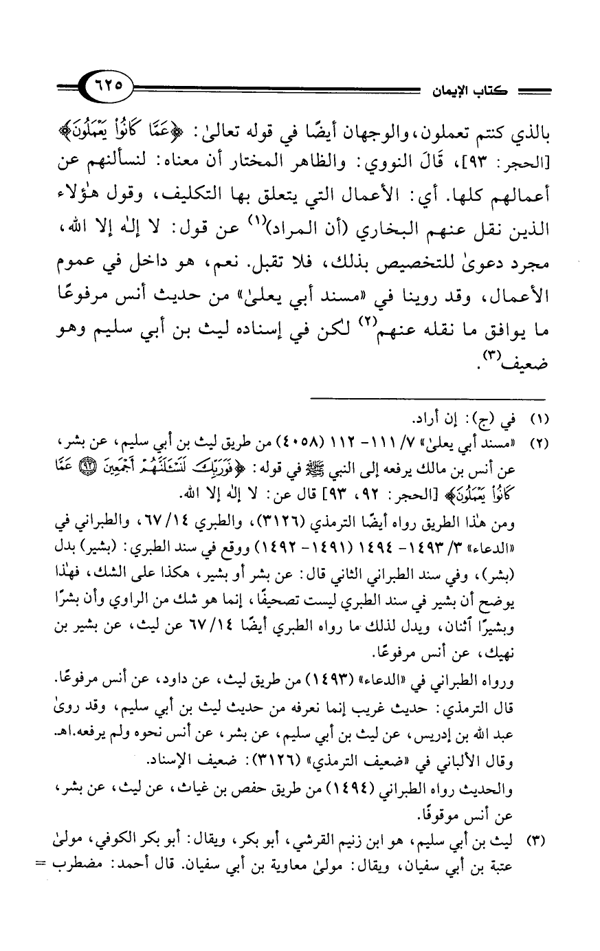 (¬2) "مسند أبي يعلى"، 7/ 111 - 112 (4058) من طريق ليث بن أبي سليم، عن بشر، عن أنس بن مالك يرفعه إلى النبي - صلى الله عليه وسلم - في قوله: {فَوَرَبِّكَ لَنَسْأَلَنَّهُمْ أَجْمَعِينَ (92) عَمَّا كَانُوا يَعْمَلُونَ} [الحجر: 93،92] قال عن: لا إله الا الله.