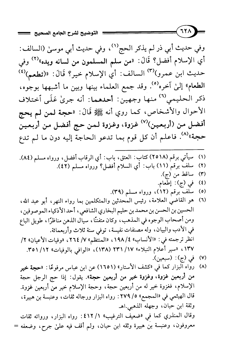 وفي حديث أبي ذر لم يذكر الحج (¬1)، وفي حديث أبي موسى (السالف: أي الإسلام أفضل؟ قَالَ: "من سلم المسلمون من لسانه ويده" (¬2) وفي حديث ابن عمرو) (¬3) السالف: أي الإسلام خير؟ قَالَ: " (تطعم) (¬4) الطعام" إلى آخره (¬5). وقد جمع العلماء بينها وبين ما أشبهها بوجوه، ذكر الحليمي (¬6) منها وجهين: أحدهما: أنه جرى عَلَى اختلاف الأحوال والأشخاص، كما روي أنه - صلى الله عليه وسلم - قَالَ: "حجة لمن لم يحج أفضل من (أربعين) (¬7) غزوة، وغزوة لمن حج أفضل من أربعين حجة" (¬8). فاعلم أن كل قوم بما تدعو الحاجة إليه دون ما لم تدع