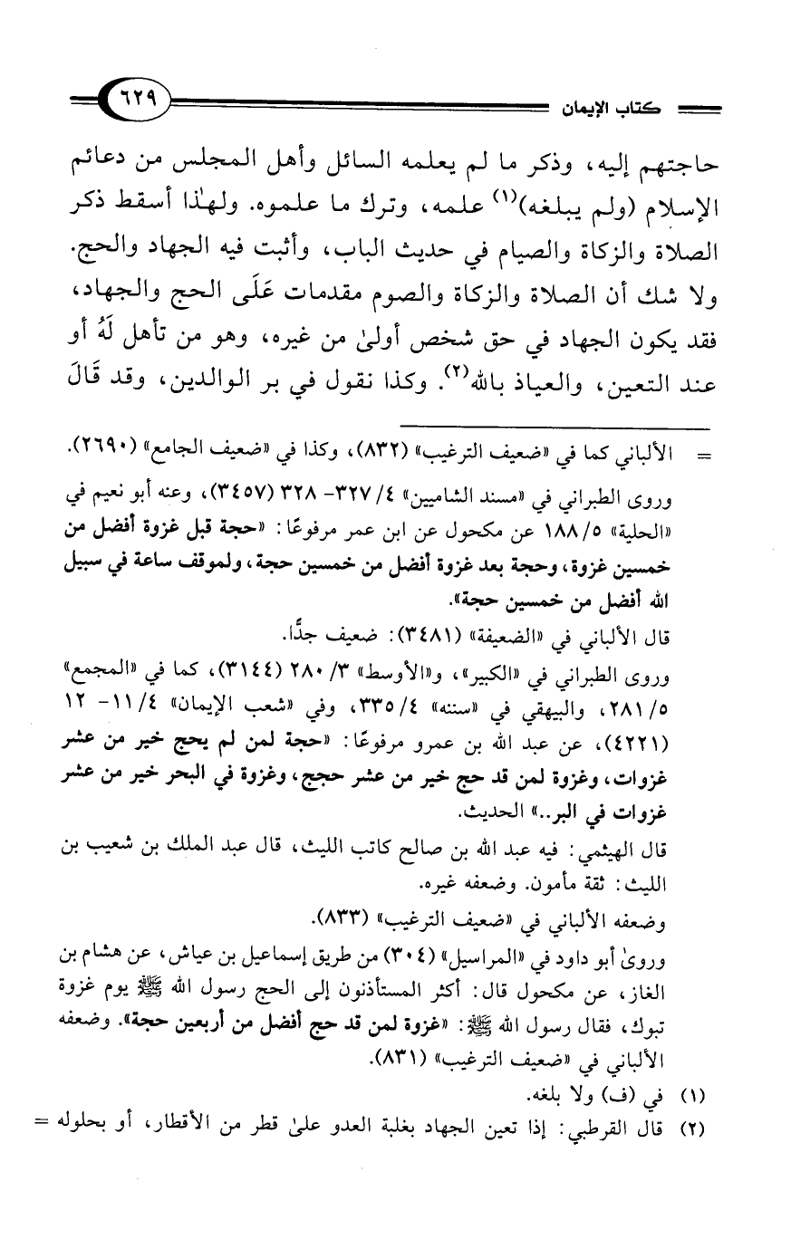 ولا شك أن الصلاة والزكاة والصوم مقدمات عَلَى الحج والجهاد، فقد يكون الجهاد في حق شخص أولى من غيره، وهو من تأهل لَهُ أو عند التعين، والعياذ بالله (¬2). وكذا نقول في بر الوالدين، وقد قَالَ