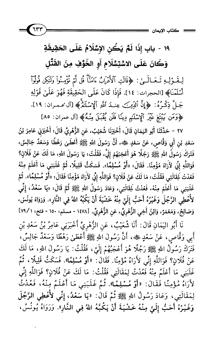 27 - حَدَّثَنَا أَبُو الْيَمَانِ قَالَ: أَخْبَرَنَا شُعَيْبٌ، عَنِ الزُّهْرِيِّ قَالَ: أَخْبَرَنِي عَامِرُ بْنُ سَعْدِ بْنِ أَبِي وَقَّاصٍ، عَنْ سَعْدٍ - رضي الله عنه -، أَنَّ رَسُولَ اللهِ - صلى الله عليه وسلم - أَعْطَى رَهْطًا وَسَعْدٌ جَالِسٌ، فَتَرَكَ رَسُولُ اللهِ - صلى الله عليه وسلم - رَجُلاً هُوَ أَعْجَبُهُمْ إِلَىَّ، فَقُلْتُ يَا رَسُولَ اللهِ مَا لَكَ عَنْ فُلاَنٍ؟ فَوَاللهِ إِنِّي لأَرَاهُ مُؤْمِنًا. فَقَالَ: "أَوْ مُسْلِمًا". فَسَكَتُّ قَلِيلاً، ثُمَّ غَلَبَنِى مَا أَعْلَمُ مِنْهُ فَعُدْتُ لِمَقَالَتِي فَقُلْتُ: مَا لَكَ عَنْ فُلاَنٍ؟ فَوَاللهِ إِنِّي لأَرَاهُ مُؤْمِنًا فَقَالَ: "أَوْ مُسْلِمًا". ثُمَّ غَلَبَنِى مَا أَعْلَمُ مِنْهُ، فَعُدْتُ لِمَقَالَتِي، وَعَادَ رَسُولُ اللهِ - صلى الله عليه وسلم - ثُمَّ قَالَ: "يَا سَعْدُ، إِنِّي لأُعْطِى الرَّجُلَ وَغَيْرُهُ أَحَبُّ إِلَيَّ مِنْهُ خَشْيَةَ أَنْ يَكُبَّهُ اللهُ فِي النَّارِ". وَرَوَاهُ يُونُسُ، وَصَالِحٌ، وَمَعْمَرٌ، وَابْنُ أَخِي الزُّهْرِىِّ، عَنِ الزُّهْرِىِّ. [1478 - مسلم: 150 - فتح: 1/ 79]