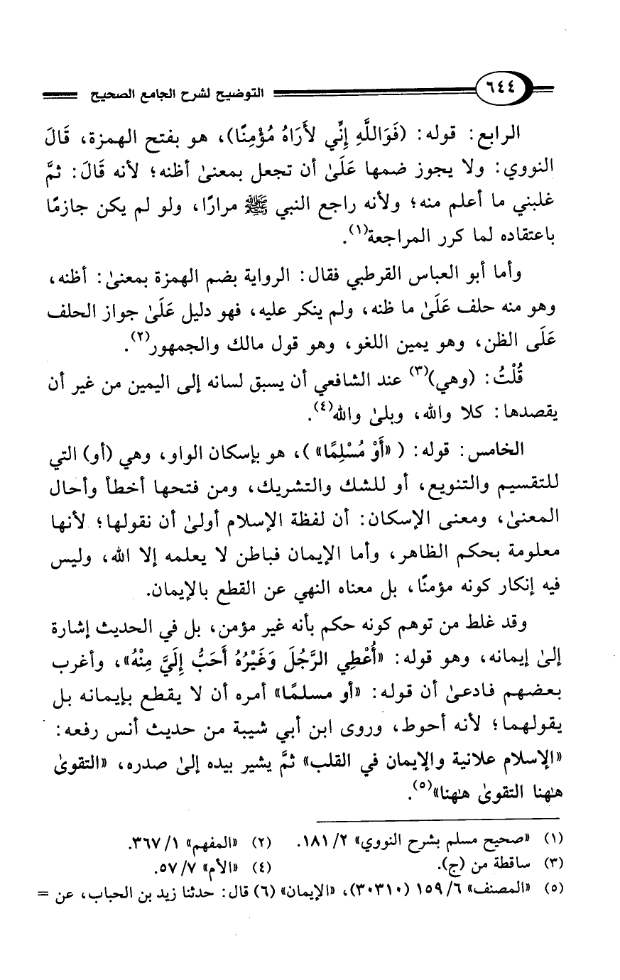 الخامس: قوله: ("أَوْ مُسْلِمًا")، هو بإسكان الواو، وهي (أو) التي للتقسيم والتنويع، أو للشك والتشريك، ومن فتحها أخطأ وأحال المعنى، ومعنى الإسكان: أن لفظة الإسلام أولى أن نقولها؛ لأنها معلومة بحكم الظاهر، وأما الإيمان فباطن لا يعلمه إلا الله، وليس فيه إنكار كونه مؤمنًا، بل معناه النهي عن القطع بالإيمان.