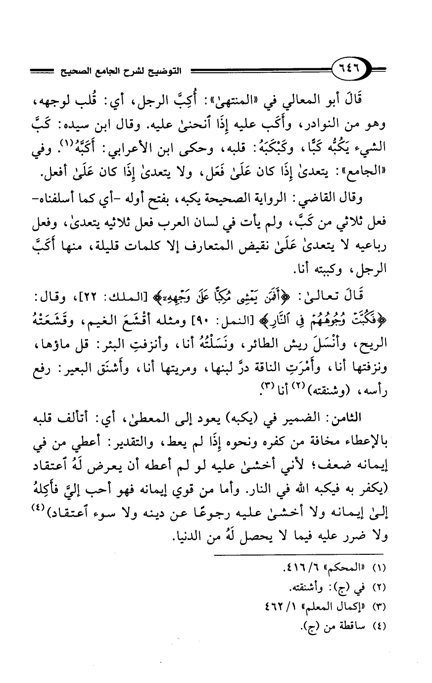 وقال القاضي: الرواية الصحيحة يكبه، بفتح أوله -أي كما أسلفناه- فحل ثلاثي من كَبَّ، ولم يأت في لسان العرب فعل ثلاثيه يتعدى، وفعل رباعيه لا يتعدى عَلَى نقيض المتعارف إلا كلمات قليلة، منها أَكَبَّ الرجل، وكببته أنا.