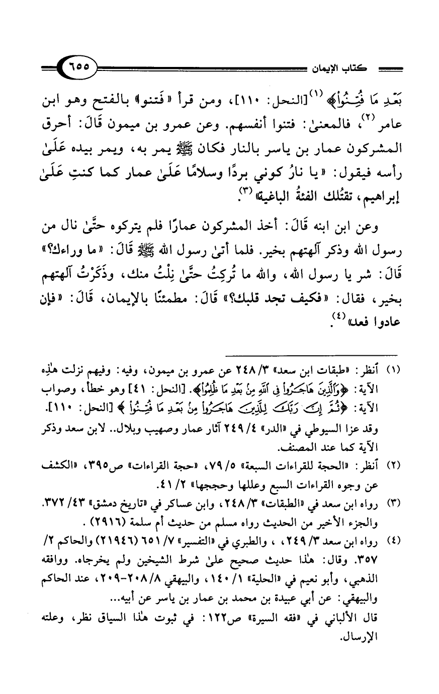 بَعْدِ مَا فُتِنُوا} (¬1) [النحل: 110]، ومن قرأ "فَتنوا" بالفتح وهو ابن عامر (¬2)، فالمعنى: فتنوا أنفسهم. وعن عمرو بن ميمون قَالَ: أحرق المشركون عمار بن ياسر بالنار فكان - صلى الله عليه وسلم - يمر به، ويمر بيده عَلَى رأسه فيقول: "يا نارُ كوني بردًا وسلامًا عَلَى عمار كما كنت عَلَى إبراهيم، تقتُلك الفئةُ الباغية" (¬3).