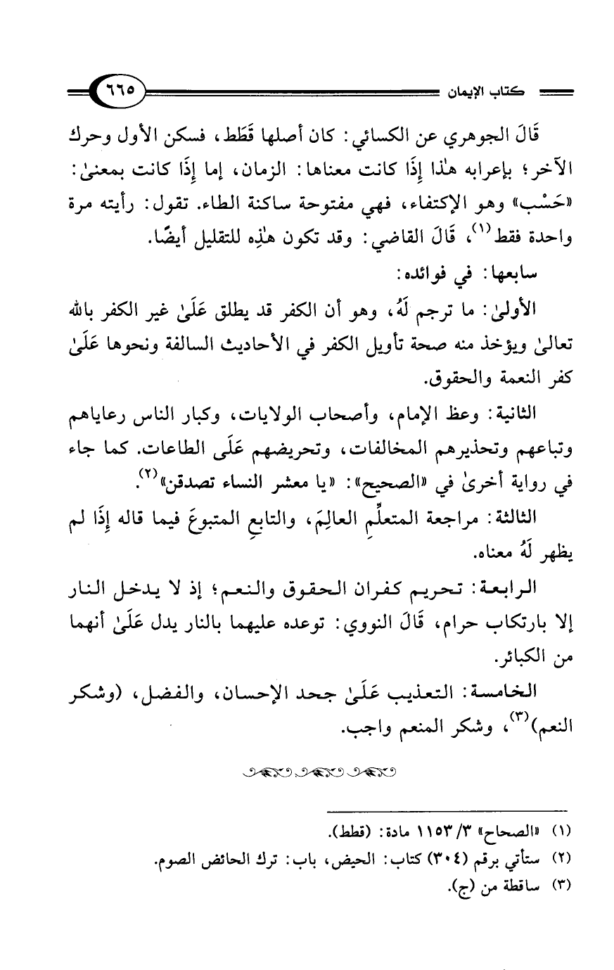 الرابعة: تحريم كفران الحقوق والنعم؛ إذ لا يدخل النار إلا بارتكاب حرام، قَالَ النووي: توعده عليهما بالنار يدل عَلَى أنهما من الكبائر.