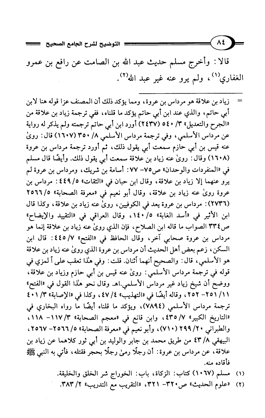 = زياد بن علاقة هو مرداس بن عروة، ومما يؤكد ذلك أن المصنف عزا قوله هنا لابن أبي حاتم، والذي عند ابن أبي حاتم يؤكد ما قلناه، ففي ترجمة زياد بن علاقة من "الجرح والتعديل" 3/ 540 (2437) أورد ابن أبي حاتم ترجمته ولم يذكر له رواية عن مرداس الأسلمي، وفي ترجمة مرداس الأسلمي 8/ 350 (1607) قال: روى عنه قيس بن أبي حازم سمعت أبي يقول ذلك، ثم أورد ترجمة مرداس بن عروة (1608) وقال: روى عنه زياد بن علاقة سمعت أبي يقول ذلك. وأيضًا قال مسلم في "المنفردات والوحدان" ص 75 - 77: أسامة بن شريك، ومرداس بن عروة لم يرو عنهما إلا زياد بن علاقة، وقال ابن حبان في "الثقات" 5/ 449: مرداس بن عروة روى عنه زياد بن علاقة، وقال أبو نعيم في "معرفة الصحابة" 5/ 2566 (2736): مرداس بن عروة يعد في الكوفيين، روى عنه زياد بن علاقة، وكذا قال ابن الأثير في "أسد الغابة" 5/ 140، وقال العراقي في "التقييد والإيضاح" ص 334 الصواب ما قاله ابن الصلاح، فإن الذي روى عنه زياد بن علاقة إنما هو مرداس بن عروة صحابي آخر، وقال الحافظ في "الفتح" 7/ 445: قال ابن السكن، زعم بعض أهل الحديث أن مرداس بن عروة الذي روى عنه زياد بن علاقة هو الأسلمي، قال: والصحيح أنهما اثنان. قلت: وفي هذا تعقب على المزي في قوله في ترجمة مرداس الأسلمي: روى عنه قيس بن أبي حازم وزياد بن علاقة، ووضح أن شيخ زياد غير مرداس الأسلمي. اهـ. وقال نحو هذا القول في "الفتح" 11/ 251 - 252، وقاله أيضًا في "التهذيب" 4/ 47، وكذا في "الإصابة" 3/ 401 ترجمة مرداس الأسلمي (7894)، ويؤكد ما قلناه أيضًا ما رواه البخاري في "التاريخ الكبير" 7/ 435، وابن قانع في "معجم الصحابة" 3/ 117 - 118، والطبراني 20/ 299 (710)، وأبو نعيم في "معرفة الصحابة" 5/ 2566 - 2567، البيهقي 8/ 43 من طريق محمد بن جابر والوليد بن أبي ثور كلاهما عن زياد بن علاقة، عن مرداس بن عروة: أن رجلًا رمى رجلًا بحجر فقتله، فأتي به النبي - صلى الله عليه وسلم - فأقاده منه.